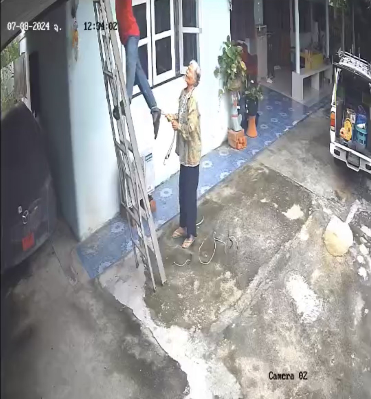 โดยกล้องวงจรปิด สามารถบันทึกภาพ เหตุการณ์ดังกล่าว ไว้ได้ ขณะช่างไฟมือถูกกระแสไฟฟ้าช็อต ก่อนส่งเสียงเรียกให้คนช่วย คุณยาย จึงรีบไปหยิบเชือกเข้าไปคล้องที่ข้อเท้าขวา และดึงตัวให้หลุด จนร่างตกกระแทกพื้น นอนหมดสติ คุณยาย รีบเข้าไปปลุกเรียกให้ตื่น พร้อมปั๊มหัวใจ