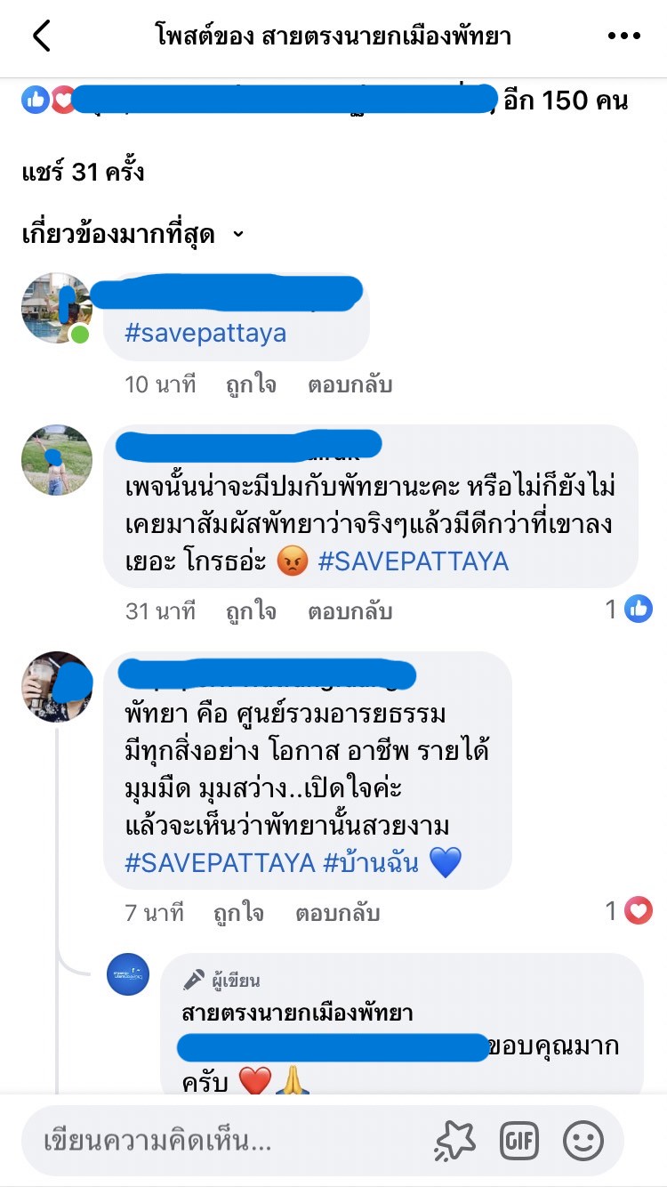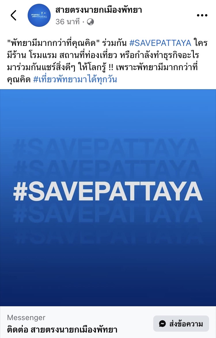 ล่าสุด มีรายงานความเคลื่อนไหวผ่านโซเชียลเน็ตเวิร์กให้มีการรณรงค์ติดแฮ็ชแท็ก #savepattaya โดยทางด้านเฟซบุ๊กแฟนเพจ สายตรงนายกเมืองพัทยา ได้โพสต์ระบุว่า “พัทยามีมากกว่าที่คุณคิด” ร่วมกัน #SAVEPATTAYA ใครมีร้าน โรงแรม สถานที่ท่องเที่ยว หรือกำลังทำธุรกิจอะไร มาร่วมกันแชร์สิ่งดีๆ ให้โลกรู้ !! เพราะพัทยามีมากกว่าที่คุณคิด #เที่ยวพัทยามาได้ทุกวัน
