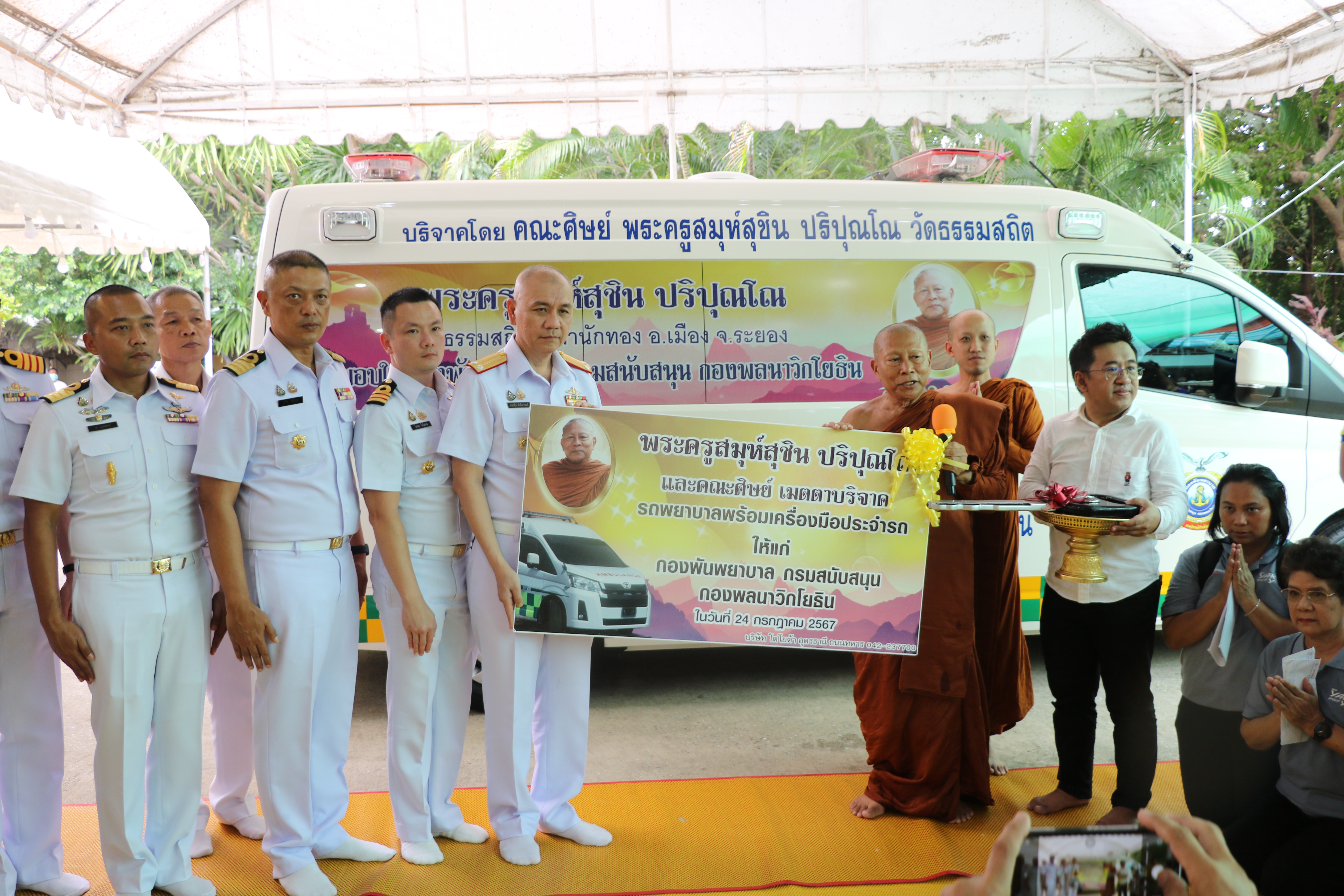 เมื่อวันที่ 24 ก.ค.67 พลเรือตรี ประทีป ตังติสานนท์ รองเจ้ากรมแพทย์ทหารเรือ พลเรือตรี ดนัย ปานแดง ผู้อำนวยการโรงพยาบาลสมเด็จพระนางเจ้าสิริกิติ์ กรมแพทย์ทหารเรือ นาวาเอก สุเชษฐ ตรรกธาดา รองผู้อำนวยการโรงพยาบาลอาภากรเกียรติวงศ์ ฐานทัพเรือสัตหีบ นาวาเอกวรวิช หิรัญสุข ผู้บังคับการกรมสนับสนุน กองพลนาวิกโยธิน หน่วยบัญชาการนาวิกโยธิน นาวาโท โสภณ ใบโสภณ ผู้บังคับกองพันพยาบาล กรมสนับสนุน กองพลนาวิกโยธิน หน่วยบัญชาการนาวิกโยธิน ร่วมงานอายุวัฒนมงคล 72 ปี พระอาจารย์สุชิน ปริปุณโณ และรับมอบรถยนต์พยาบาลพร้อมเครื่องมือประจำรถ โดย คณะศิษย์ พระครูสมุห์สุชิน ปริปุณโณ ให้แก่ กองพันพยาบาล กรมสนับสนุน กองพลนาวิกโยธิน หน่วยบัญชาการนาวิกโยธิน เพื่อใช้ในราชการของหน่วยต่อไป ณ วัดธรรมสถิต ตำบลสำนักทอง อำเภอเมือง จังหวัดระยอง