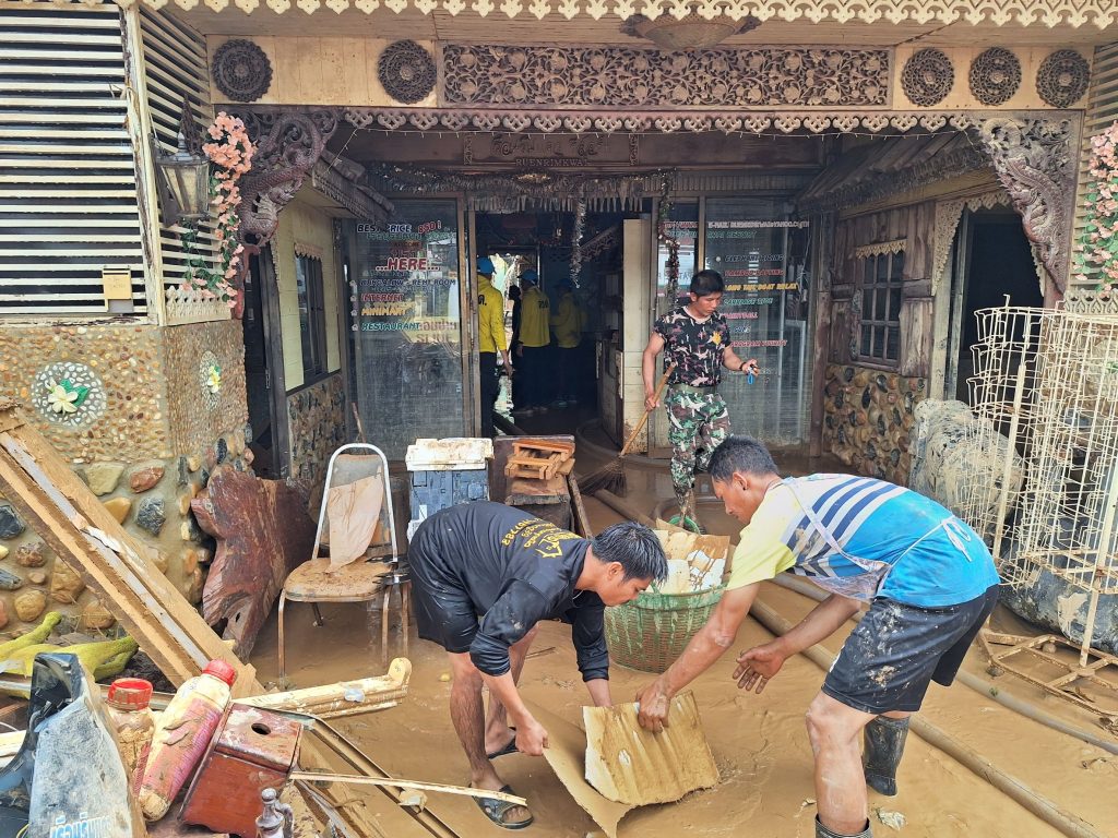 เมื่อเวลา 10.00น.วันที่ 30 ก.ค.2567 หลังจากระดับลดจนเข้าสู่ภาวะเกือบจะเป็นปกติ ปัญหาที่เกิดขึ้นตามมาพบว่าบนถนนและบ้านเรือนประชาชน มีโคลนเลนเต็มไปหมด บนซากปรักหักพังสิ่งของเครื่องใช้ต่างๆ ปภ.จังหวัดกาญจนบุรีตั้งรถครัวปรุงอาหารที่บริเวณวัดน้ำตก ซึ่งห่างจะบ้านปากแซงซึ่งภัยพิบัติราว3กม. โดยหลังปรุงเสร็จได้ใส่กล่องนำลงไปแจกจ่ายให้ชาวบ้านที่ได้รับความเดือดร้อน ขณะเดียวกัน นายอนันต์ โพธิ์พันธ์ ผู้อำนวยการสำนักบริหารพื้นที่อนุรักษ์ที่ 3 บ้านโป่งเปิดเผยว่า นายอรรถพล เจริญชันษา อธิบดีกรมอุทยานแห่งชาติ สัตว์ป่าและพันธุ์พืช ได้สั่งการให้ส่งกำลังเจ้าหน้าที่อุทยานฯ ที่อยู่ใกล้ที่เกิดภัยพิบัติ เข้าช่วยเหลือชาวบ้านในทันที โดยนายสาคร สืบสาย หัวหน้าอุทยานฯไทรโยค ได้นำกำลังเจ้าหน้าที่กว่า20คนเดินไปช่วยเหลือชาวบ้านแล้ว ด้านพ.ต.อ.สุกิจ ก้องจตุศักดิ์ ผกก.ตชด.ที่13 ได้สั่งการให้ตชด.136 อ.ไทรโยค นำรถฉีดน้ำพร้อมกำลังเดินทางไปร่วมช่วยเหลือประชาชน ที่ประสพภัยพิบัติบริเวณบ้านปากแซง เช่นกัน