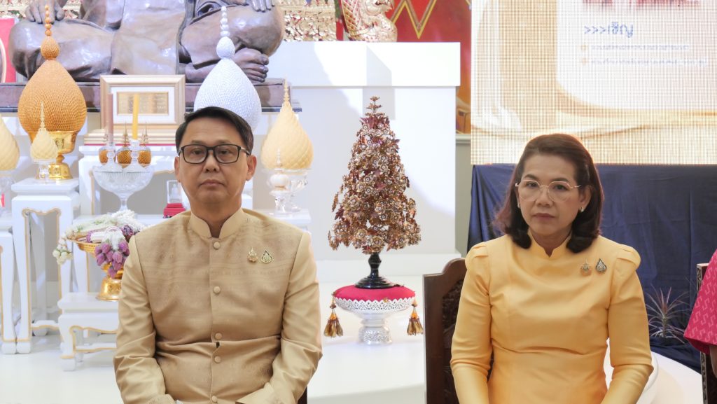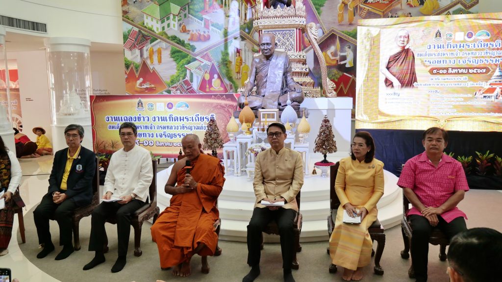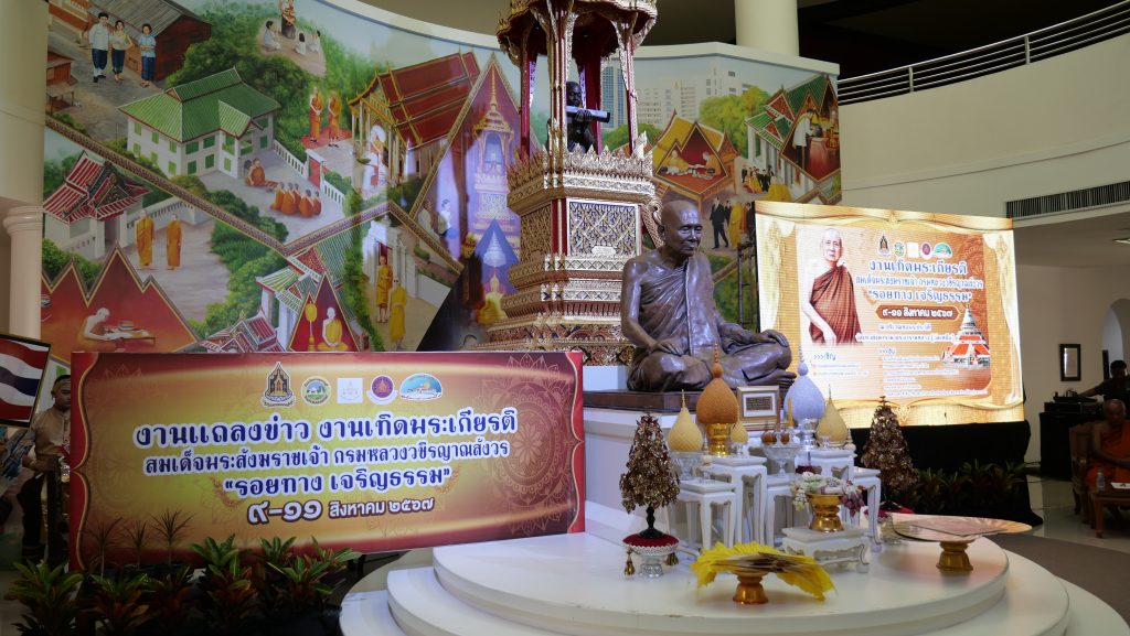 นางสมมารถ คำถนอม วัฒนธรรมจังหวัดกาญจนบุรี นายอุดม เหลืองสด รองนายกเทศมนตรีเมืองกาญจนบุรี นายชาตรี เนียมหอมนายกเทศมนตรีตำบลดอนเจดีย์ ดร.ธีรชัย ชุติมันต์ ประธานสภาวัฒนธรรมจังหวัดกาญจนบุรีและประธานคณะกรรมการพัฒนาหอพระประวัติสมเด็จพระสังฆราชเจ้า กรมหลวงวชิรญาณสังวรร่วมแถลงข่าวการจัดงานเทิดพระเกียรติ สมเด็จพระสังฆราชเจ้า กรมหลวงวชิรญาณสังวร “รอยทาง เจริญธรรม”