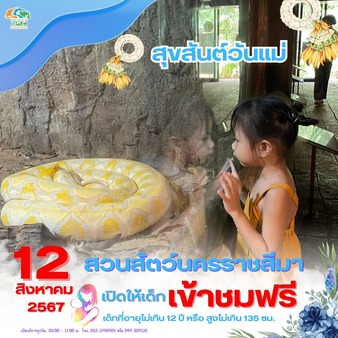 นายธนชน เคนสิงห์ ผู้อำนวยการสวนสัตว์นครราชสีมา เปิดเผยว่า เนื่องในวันที่ 12 สิงหาคม 2567 ซึ่งเป็นวันคล้ายวันพระราชสมภพของของสมเด็จพระนางเจ้าสิริกิติ์ พระบรมราชินีนาถ พระบรมราชชนนีพันปีหลวง สวนสัตว์นครราชสีมา โดยองค์การสวนสัตว์แห่งประเทศไทย ในพระบรมราชูปถัมภ์ (ZPOT) ขอมอบของขวัญให้เด็กๆที่มีอายุไม่เกิน 12 ปี เข้าสวนสัตว์ฟรี (เฉพาะวันที่ 12 สิงหาคม 2567 นี้เท่านั้น) ชมความน่ารักของสัตว์ป่าน้อยใหญ่ เปิดประสบการณ์ รับความรู้มากมาย หรือจะมาพักผ่อนหย่อนใจกับครอบครัว และมีกิจกรรมให้น้องๆหนูๆ ได้ร่วมสนุกกัน อาทิ แม่-ลูกผูกพัน ชวนกันเที่ยวสวนสัตว์ สำหรับแม่-ลูก 92 ท่านแรก ที่เกิดในเดือนสิงหาคม รับของทีระลึกจากทางสวนสัตว์ และสำหรับทุกครอบครัวที่สวมชุดผ้าไทย ตลอดเดือนสิงหาคม รับของทีระลึกจากทางสวนสัตว์ (มีจำนวนจำกัด) ชมความยิ่งใหญ่ กับพี่เบิ้ม Big Five 5 ผู้ยิ่งใหญ่แห่งทุ่งหญ้าแอฟริกา และยังมีกิจกรรมพิเศษต่าง ๆ มากมาย เช่น การจัดนิทรรศการวันแม่แห่งชาติ วาดภาพระบายสี เล่นเกมส์ตอบคำถาม นิทรรศการการส่งเสริมองค์ความรู้ตัวอย่างสัตว์ Specimens กะโหลกสัตว์ เขาสัตว์ เป็นต้น