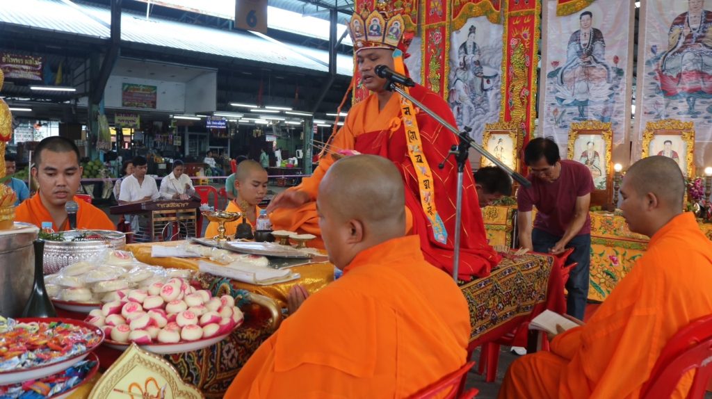 ช่วงเช้าคณะสงฆ์จากวัดอนัมนิกาย สวดเจริญพุทธมนต์ ต่อด้วยสวดบูชาข้าวพระพุทธ “ก๋งสุด” สวดโคว๋ หลังจากนั้น ช่วงบ้านจะเริ่มมารอรับ ของแจกทาน ข้าวสารอาหารแห่ง จำนวน 2,000 ชุด โดยการแจกทานในครั้งนี้ เจ้าของตลาดได้ทำบุญและแจกทานเพื่อเป็นการสร้างทานบารมีให้กับตลาดแห่งนี้ และยังมีร้านผลไม้เจ้ศรีตลาดปฐมมงคลยังได้ร่วมแจกเงินให้กับชาวบ้านทั้งเด็กและคนแก่อีกด้วย