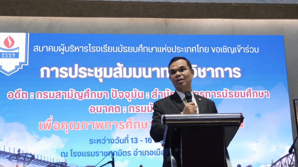 เมื่อวันที่ 15 สิงหาคม 2567 เวลา 09.30 น. ที่ห้องประ ชุมคอนเวนชั่น โรงแรมราชศุภมิตร ตำบลท่ามะขาม อำเภอเมือง จังหวัดกาญจนบุรี สมาคมผู้บริหารโรง เรียนมัธยมศึกษาแห่งประเทศไทย (ส.บ.ม.ท.) จัดประชุมสัมมนาทางวิชาการเรื่อง อดีต : กรมสามัญศึกษา ปัจจุบัน : สำนักบริหารการมัธยมศึกษา อนาคต : กรมมัธยมศึกษา “เพื่อคุณภาพการศึกษา เรียนดี มีความสุข”โดยได้รับเกียรติจาก ว่าที่ร้อยตรี ดร.ธนุ วงษ์จินดา เลขาธิการคณะกรรมการการศึกษาขั้นพื้นฐาน เป็นประธานพิธีเปิดการประชุมสัมมนาเรื่อง อดีต : กรมสามัญศึกษา ปัจจุบัน : สำนักบริหารการมัธยมศึกษา อนาคต : กรมมัธยมศึกษา “เพื่อคุณภาพ การศึกษา เรียนดี มีความสุข” พร้อมบรรยายพิเศษ หัวข้อเรื่อง “ทิศทางการบริหารสู่คุณภาพ เรียนดี มีความสุข” พร้อมด้วย ดร.เกศทิพย์ ศุภวานิช รองเลขาธิการ คณะกรรมการการศึกษาขั้นพื้นฐาน ร่วมบรรยายพิเศษเรื่อง การขับเคลื่อนคุณภาพการศึกษา ” นายเฉลา พวงมาลัย ประธานอนุกรรมาธิการการศึกษาขั้นพื้นฐาน วุฒิสภา และนายกฤษฎา คำอาจ ผอ.กลุ่มนโยบายและแผน สพม.ราชบุรี ร่วมบรรยายพิเศษ ร้อยโททศพล ไชยโกมินทร์ ผู้ว่าราชการจังหวัดกาญจนบุรี กล่าวต้อนรับสมาชิกฯ พร้อมด้วย ว่าที่ร้อยตรี ศุภมงคล บูชาถ่ายเทศ รองผู้ว่าราชการจังหวัดกาญจนบุรี เข้าร่วมงานโดย ดร.ณรินทร์ ชำนาญดู นายกสมาคมผู้บริ หารโรงเรียนมัธยมศึกษาแห่งประเทศไทย (ส.บ.ม.ท.) นายสามารถ รอดสำราญ อุปนายกสมาคมคนที่ 1 นายศิวรัตน์ พายุหะ เลขาธิการสมาคมฯ นายวีระชัย บุญอยู่ เหรัญญิกสมาคม พร้อมด้วย ดร.สุมน ธิกุลวงศ์ นายกสมาคมผู้บริหารหญิงโรงเรียนมัธยมศึกษาแห่งประ เทศไทย ดร.นิวัฒน์ นาคะเวช นายกสภาผู้ปกครองและครูแห่งประเทศไทย นายปรีชา จิตรสิงห์ นายกสมาคมกรรมการสถานศึกษาขั้นพื้นฐาน อุดมพรมใจประธาน อ.ก.ค.ศ. สพม. กทม.เขต 2 ดร.วิสิทธิ์ ใจเถิง รองศึกษาธิการภาค 1 ดร.รัชชัยย์ ศรสุวรรณ นายกสมาคมผู้บริหารครูและบุคลากรทางการศึกษาและสมาชิกซึ่งเป็นผู้บริหารการศึกษา ผู้บริหารสถานศึกษาโรงเรียนมัธยมทั่วประเทศ จำนวน 5,000 คน เข้าร่วมสัมมนาฯ