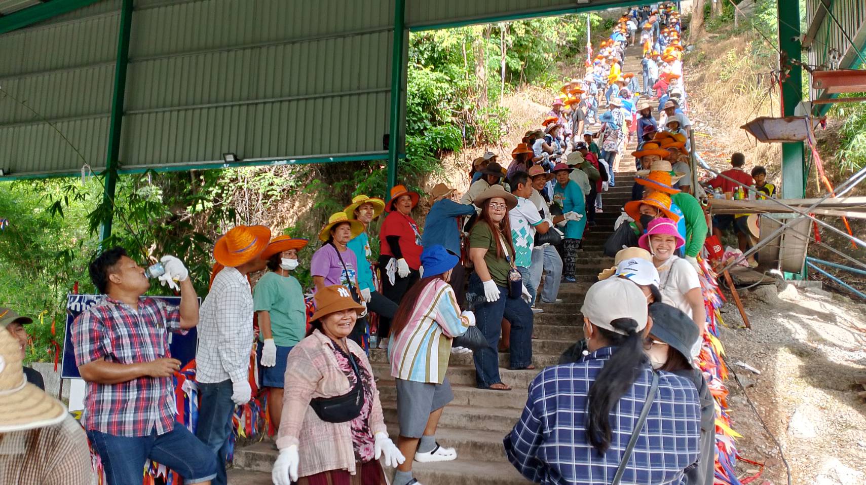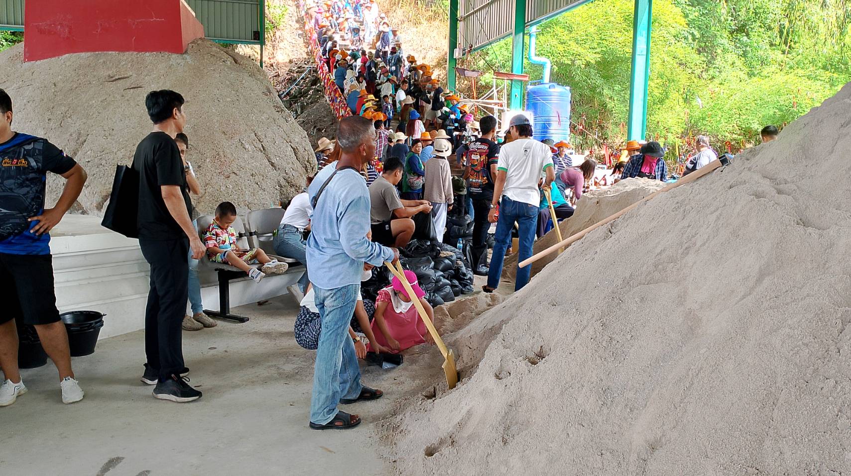 มาช่วยกันขนทราย 2 คันรถสิบล้อ หินอีก1 เที่ยวรถ แม่แบบ โดยได้ยืนต่อแถวเรียงรายขึ้นไปตามขั้นบันได 182 ขั้น ก่อนจะช่วยผลัดกันหิ้วทราย ขนหินส่งต่อกันเป็นทอดๆขึ้นไปบนยอดเขาตะแบก ซึ่งเป็นภาพพลังศรัทธาสามัคคีที่น่าประทับใจเป็นอย่างมากซึ่งการขนทราย ขนหินจะเสร็จสิ้นในเวลา15.00น.เป็นอย่างช้าโดยในครั้งนี้ได้มีนายเดชา จันทร์เล็ก ประธานสภาอบจ.ชลบุรีและผู้นำท้องถิ่นในพื้นที่หมู่4 ตำบลหนองขามมาร่วมในครั้งนี้ด้วย
