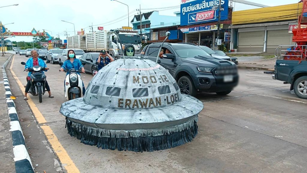 ขณะที่งานจะมีพิธีเปิดในช่วงหัวค่ำ ตอนเช้ามีการเตรียมขบวนแห่บั้งไฟ ชาวบ้านและนักท่องเที่ยว ต้องแตกตื่นตกใจ เมื่อเห็นจานบิน UFO บินผ่านบนถนนบริเวณ 4 แยกไฟแดง อ.เอราวัณ อยู่ 2-3 รอบ จากนั้นก็บินหายไป สร้างความสนุกสนานให้กับนักท่องเที่ยวที่มาเที่ยวงาน