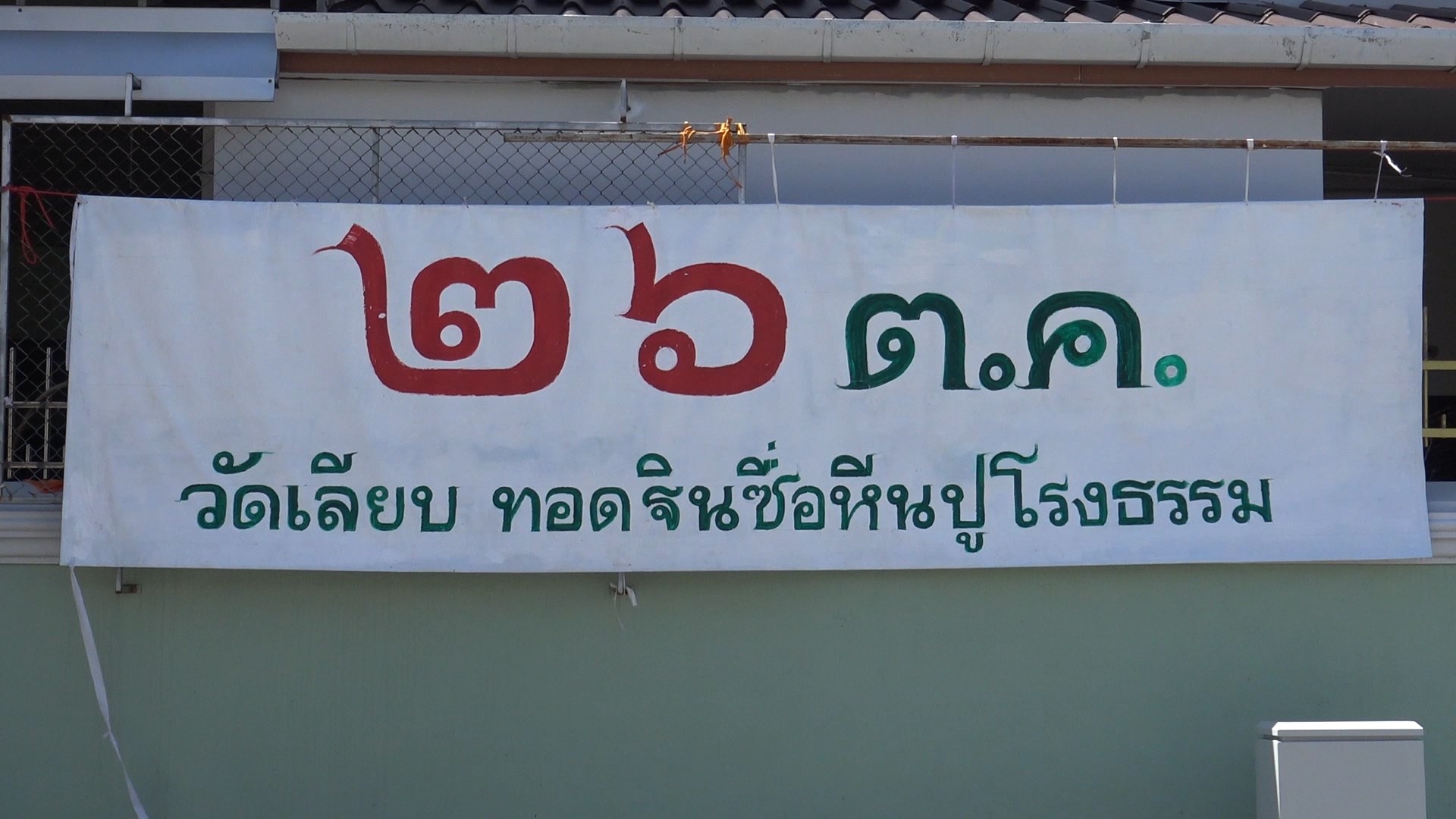 วันที่ 27 ก.ย. 2567 ผู้สื่อข่าวรายงานว่าที่วัดเลียบสงขลาได้ทำการเขียนป้ายบอกบุญเพื่อแจ้งให้กับประชาชนทราบติดที่บริเวณกำแพงวัดตรงสี่แยกไฟแดง เป็นที่สะดุดตา ของผู้คนที่ผ่านไปมาเห็นเด่นชัดตามสไตล์ของเจ้าอาวาสที่ต้องการใช้ภาษาถิ่นเขียนข้อความเพื่อให้ประชาชนเข้าใจง่าย โดยป้ายแรก ที่พระครูนพกิจโกศล เจ้าอาวาสวัดเลียบ อ.เมือง จ.สงขลา ซึ่งเป็นคนเขียนข้อความในป้ายผ้าเป็นภาษาถิ่น ติดที่บริเวณกำแพงวัดตรงสี่แยกไฟแดง ป้ายแรกมีข้อความว่า “๒๖ ต.ค. วัดเลียบ ทอดฐินซื่อหีนปูโรงธรรม” ป้ายที่สอง “โรงธรรมวัดเลียบ เบื้องดุ้งทั้งหลัง สมภารน้ำตาล้างหนวย ไม่ถึงกับร้อง เซ่อหีนปู ๒๒๔ ตร.ม. ตร.ม.๘๐๐ บ. ค่อยทำบุญตทอดฐินทีเดียว น๊ะโยม” สร้างความฮือฮากับชาวบ้านที่สัญจรผ่านไปมา