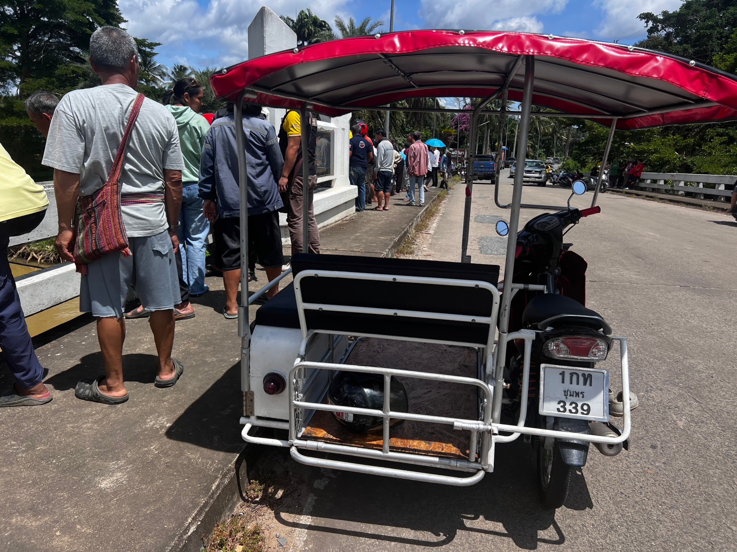 ในที่เกิดเหตุมีบรรดาไทยมุงจำนวนมากยืนดูเหตุการณ์อยู่ฟุตบาทสะพานเทศบาล 4 ซึ่งเป็นสะพานข้ามแม่น้ำท่าตะเภา เชื่อมต่อระหว่างเขตเทศบาลเมืองกับเทศบาลตำบลบางลึก อ.เมือง จ.ชุมพร เจ้าหน้าที่พบรถ จยย.ยี่ห้อยามาฮ่า รุ่นสปาร์ค สีแดง หมายเลขทะเบียน 1 กท 339 ชุมพร ซึ่งต่อเติมเป็นซาเล้งหรือรถพ่วงข้าง ดัดแปลงมีเบาะที่นั่ง และติดตั้งหลังคาอย่างดี จอดอยู่บนสะพานข้างฟุตบาท ในสภาพเครื่องยังติด และบนเรือนไมล์มีไฟโชว์ ระบุอยู่ในเกียร์ 1 และข้างรถยังพบรองเท้ายางสีขาวแบบหุ้มส้น ถูกถอดอยู่ 1 คู่ เจ้าหน้าที่จึงได้ทำการดับเครื่อง ก่อนตรวจสอบที่ตะแกงหน้ารถพบเอกสารถ่ายสำเนาบัตรประชาชนพร้อมแนบรูป ขนาด 1 นิ้วคูณ 2 นิ้ว จำนวน จำนวน 2 ชุด ระบุชื่อคือนายยุทธดนัย สุทธิมุข อายุ 34 ปี อยู่บ้านเลขที่ 45/12 ม.12 ต.ตากแดด อ.เมืองพังงา จ.พังงา โดยเอกสารสำเนาเซ็นชื่อสำเนาถูกต้องกำกับไว้เป็นอย่างดี