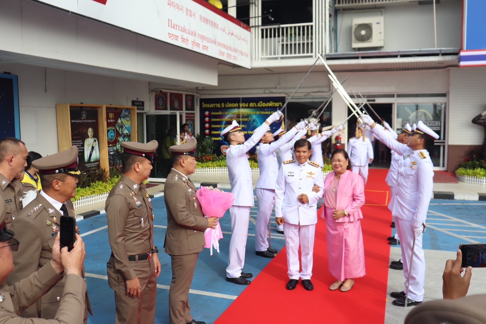 โดยบรรยากาศภายในพิธี ได้มีการมอบโล่ และรูปถ่ายเพื่อแสดงมุทิตาจิต ให้กับ 5 ตำรวจที่เกษียณราชการ และ 3 ตำรวจที่เข้าโครงการปรับเปลี่ยนกำลังพลรุ่นที่25 หลังจากนั้นได้มีการจัดพิธีลอดซุ้มกระบี่ บริเวณลานจอดรถ ด้านหน้า สภ.เมืองพัทยา ซึ่งการจัดงานในวันนี้เป็นไปด้วยความสุข และความอบอุ่นเป็นอย่างยิ่ง