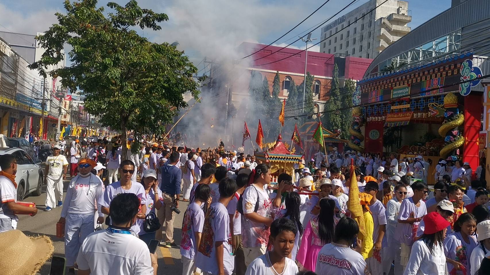 ผู้สื่อข่าวรายงงานว่าเมื่อวันที่ 7 ต.ค. 2567 ที่ผ่านมา เป็นวันที่ 5 ของงานประเพณีถือศีลกินผักจังหวัดภูเก็ต หรือ เจี๊ยะฉ่าย ประจำปี 2567 และเป็นวันที่ 4 ของการแห่พระรอบเมืองภูเก็ต หรือ พิธีอิ้วเก้ง เพื่อไปประกอบพิธีอัญเชิญควันธูปควันเทียนบริเวณปลายแหลมสะพานหิน อ.เมือง กลับมาศาลเจ้า ในวันนี้เป็นขบวนแห่ของอ๊ามท่าเรือและอ๊ามเจ่งอ๋อง โดยมีเหล่าม้าทรงชายหญิงยังคงโชว์การแสดงอภินิหารใช้อาวุธทิ่มแทงตามร่างกายเพื่อรับเคราะห์แทนผู้เข้าร่วมถือศีลกินผัก และตลอดเส้นทางที่ขบวนแห่พระผ่านจะมีประชาชนตั้งโต๊ะรับพระหน้าบ้าน และมีนักท่องเที่ยวทั้งชาวไทยและชาวต่างชาติต่างรอชมขบวนแห่พระเป็นจำนวนมาก