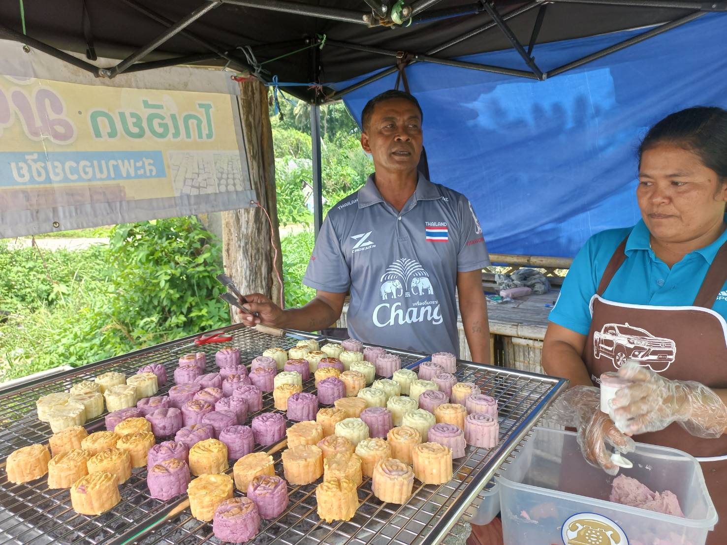 วันที่ 9 ต.ค. 2567 ผู้สื่อข่าวรายงานว่า บริเวณทางเข้าคลองชลประทาน ริมถนนสายตรัง-ปะเหลียน ก่อนถึงสี่แยกบ้านควน อ.เมืองตรัง มีร้านขายมันปิ้งที่มีลูกค้ามาอุดหนุนกันมากมาย ชื่อว่า ร้านมันทิพย์โกเอียด@กล้วยปิ้ง สะพานอวยชัย สาขา 2 ซึ่งบริเวณจุดดังกล่าวจะมีเต้นท์ขนาดเล็กกระทัดรัดที่ใช้สำหรับการปิ้งมัน ที่มี 2 สามีภรรยา คือ คุณสนิท จันทร์ฝาก อายุ 56 ปี และนางสาวจันทร์จิรา ฉิมพลีศิริ อายุ 46 ปี เป็นเจ้าของร้าน ตลอดเวลาที่ผู้สื่อข่าวลงพื้นที่พบว่ามีลูกค้าที่เดินทางเข้าซื้อกันอย่างต่อเนื่อง บางคนโทรมาสั่งจองแล้วล่วงหน้าแล้วเดินทางมารับขนม คุณจันทร์จิราภรรยาเป็นคนปั้น ส่วนคุณสนิทสามีเป็นคนปิ้ง ซึ่งเมื่อลูกค้าเข้ามาอุดหนุนก็ช่วยกันคนละไม้ละมือช่วยกันบริการลูกค้าอย่างเป็นกันเอง