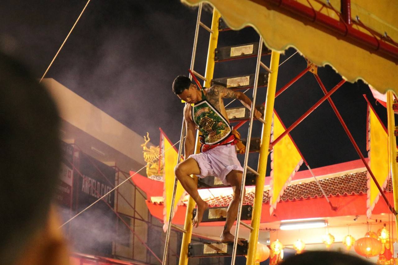 วันที่ 9 ต.ค. 2567 ที่ลานพิธีหน้าศาลเจ้าบางเหนียว ต่าวโบ้เก้ง มูลนิธิเทพราศีได้มีการประกอบพิธีปีนบันไดมีด มีประชาชนทั้งชาวไทยและชาวต่างชาติจำนวนมากให้ความสนใจเข้าร่วมชมเป็นจำนวนมาก ทั้งนี้ก่อนพิธีจะเริ่มขึ้นประชาชนและนักท่องเที่ยว นักท่องเที่ยวได้ร่วมกันไหว้พระขอพรสิ่งศักดิ์สิทธิ์ภายในศาลเจ้ากันอย่างเนืองแน่นก่อนออกไปรอชมพิธีการที่ด้านหน้าศาลเจ้า เมื่อได้เวลาม้าทรงกว่า 40 ชีวิต ของศาลเจ้าได้เริ่มประทับทรงก่อนจะออกมาที่ลานพิธี ซึ่งมีเสาบันไดมีดตั้งตระหง่าน ซึ่งลักษณะคล้ายนั่งร้าน ที่ขั้นบันไดมีใบมีดซึ่งมีความคมติดไว้ในลักษณะหงายขึ้น แบ่งเป็นขาขึ้น 36 ขั้น และขาลง 36 ขั้น รวมเป็น 72 ขั้น