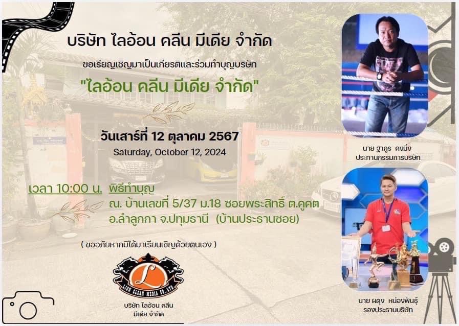 เมื่อวันที่ 12 ตุลาคม นายณพล สัมภาษณ์ บริบูรณ์ ที่ปรึกษาประธานคณะกรรมาธิการ การคุ้มครองผู้บริโภค สภาผู้แทนราษฎร และที่ปรึกษาคณะอนุกรรมาธิการ การเงิน การคลัง และ น.ส.นภชนก เหมือนนามอญ ที่ปรึกษาประธาน กมธ.คุ้มครองผู้บริโภค สภาผู้แทนราษฎร นาย ผดุง หน่องพันธ์ุ บก.รายการ “ถกไม่เถียง” รายการดังช่อง 7 HD และ นาย เอกภพ เหลืองประเสริฐ เพจสายไหมต้องรอด ได้เดินทางมาร่วมทำบุญสำนักงานบริษัท ไลอ้อน คลีน มีเดีย จำกัด ที่บ้านเลขที่ 5/37 หมู่ 18 ซอยพระสิทธิ์ ต.คูคต อ.ลำลูกกา จ.ปทุมธานี โดยมี นายฐากูร คงมิ่ง เป็นประธานกรรมการบริษัทฯ