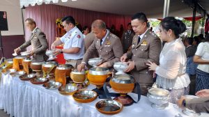 เมื่อเวลา08.00น. ของวันที่17ตุลาคม2567 ที่หน้าสถานีตำรวจภูธรบ่อวิน อำเภอศรีราชา พ.ต.อ.เอนก สระทองอยู่ ผกก.สภ.บ่่อวิน นายปริญวัฒน์ สุนทรอัคราทัศน์ ปลัดอำเภอศรีราชา นายสิรวิชฐ์ อำไพวงษ์ นายก อบต.บ่อวิน พร้อมข้าราชการตำรวจและ คณะกรรมการตรวจสอบและติดตามการบริหารงานตำรวจสภ.บ่อวินพร้อมด้วยภาครัฐและเอกชน ร่วมกัน ทำบุญถวายสังฆทานพระสงฆ์จำนวน 9 รูปอุทิศส่วนกุศลให้แก่ข้าราชการตำรวจที่เสียชีวิตจากการปฏิบัติหน้าที่เนื่องในวันตำรวจ ประจำปี 2567การทำบุญใส่บาตรข้าวสารอาหารแห้ง ถวายอาหารปิ่นโตแก่พระสงฆ์อุทิศส่วนกุศลให้แก่ข้าราชการตำรวจที่เสียชีวิตจากการปฏิบัติหน้าที่ , โดยในช่วงเช้าข้าราชการตำรวจสภ.บ่อวินทุกนายร่วมทำพิธีไหว้พระพุทธรูป และ สักการะพระภูมิเจ้าที่ พร้อมอ่านสารของผู้บัญชาการตำรวจแห่งชาติเนื่องในวันตำรวจ , เนื่องด้วยทุกวันที่ 17 ตุลาคมของทุกปี เป็นวันที่หน่วยงานในสังกัดสำนักงานตำรวจแห่งชาติ ได้ร่วมกันจัดพิธีทางศาสนา และ กิจกรรมบำเพ็ญประโยชน์ เพื่อรำลึกถึงพระคุณ อุทิศส่วนกุศลให้กับผู้ก่อตั้งกิจการตำรวจ