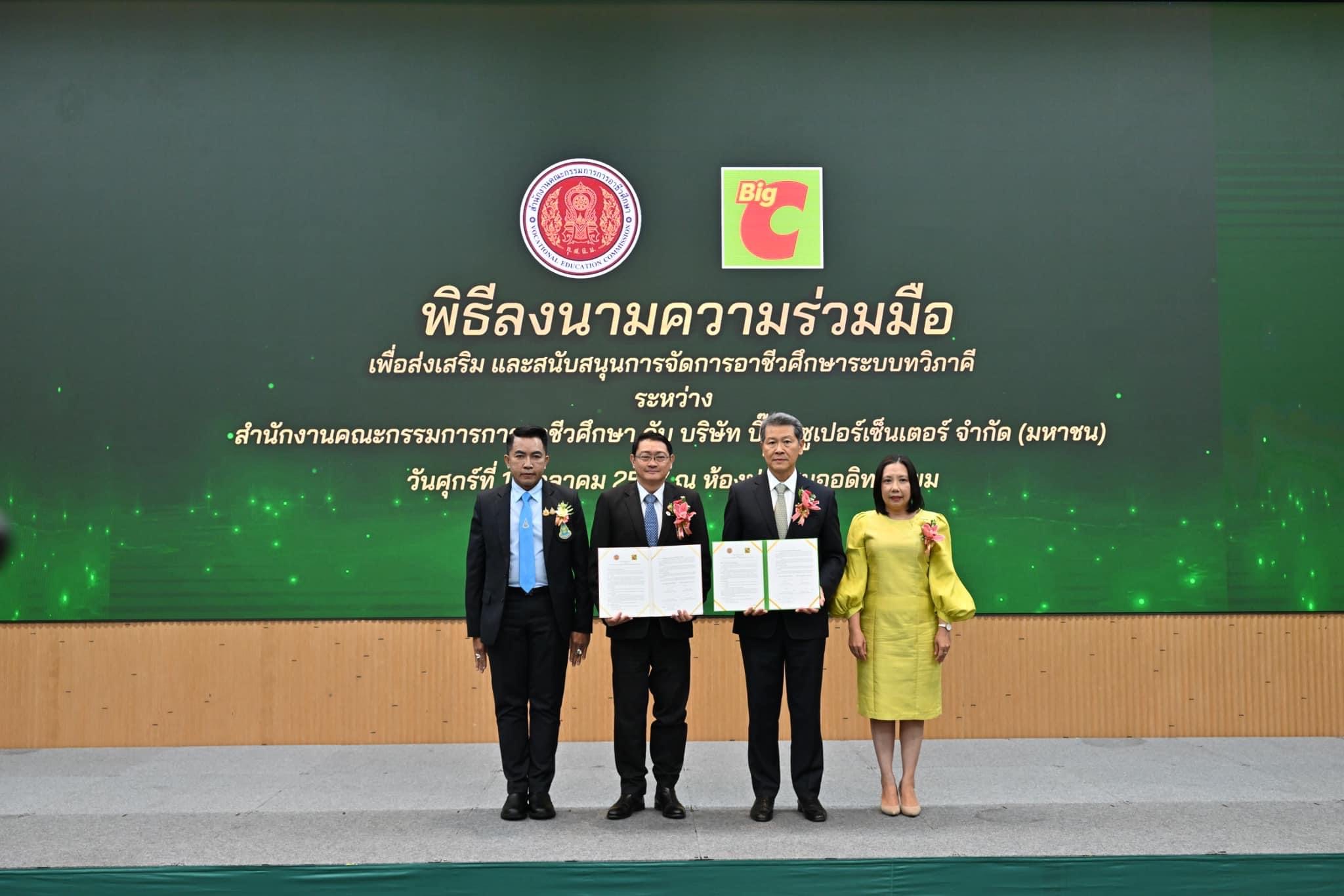 ผู้อำนวยการศูนย์อาชีวศึกษาทวิภาคี สำนักงานคณะกรรมการการอาชีวศึกษา พร้อมด้วยรองผู้อำนวยการณัฐรินีย์ สุริวงษ์รองผู้อำนวยการฝ่ายแผนงานและความร่วมมือ นางสาวณัฐนันท์ เบญจกุล หัวหน้างานความร่วมมือ และนายประวิทย์ เซ็นหลวง หัวหน้างานศูนย์ IoT ร่วมเป็นเกียรติในพิธีลงนามความร่วมมือระหว่างสำนักงานคณะกรรมการการอาชีวศึกษากับบริษัท บิ๊กซี ซูเปอร์เซ็นเตอร์ จำกัด (มหาชน)