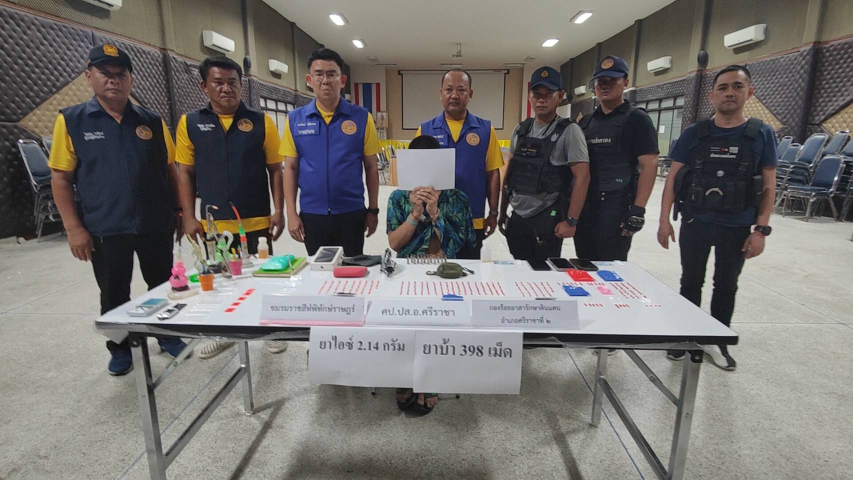 ( 22 ตุลาคม 2567) ที่ศาลาประชาคมอำเภอศรีราชา ( หลังเล็ก) ที่ว่าการอำเภอศรีราชา จังหวัดชลบุรี ภายใต้การอำนวยการของ นายธวัชชัย ศรีทอง ผู้ว่าราชการจังหวัดชลบุรี ได้มอบนโยบายให้เจ้าหน้าที่ฝ่ายปกครองคุมเข้ม ปราบปรามยาเสพติดในพื้นที่ ดังนั้น นายนพรัตน์ ศรีพรหม นายอำเภอศรีราชา จึงสั่งการให้ นายอดิศร ช่อไม้ ปลัดอำเภอศรีราชา ลงพื้นที่หมู่ 8 ตำบลบึง หลังจากที่ นายณัฐพล กุลเฉลียง ผู้ใหญ่บ้านหมู่ 8 ตำบลบึง ได้สืบทราบมาว่า ที่ร้านจำหน่ายน้ำกระท่อมแห่งหนึ่งในพื้นที่ ได้มีวัยรุ่นมาจับกลุ่มมั่วสุมกันทั้งวันทั้งคืน นำโดยนายกฤษฎา แก้วเนิน หรือ อาท อายุ 31 ปี เป็นหัวโจก โดยมีพฤติกรรมน่าสงสัยว่าจะมีการจำหน่ายยาเสพติดด้วย จึงตรวจสอบในทางลับพบว่ามีการจำหน่ายยาเสพติดจริงจึงวางแผนเข้าทำการจับกุม
