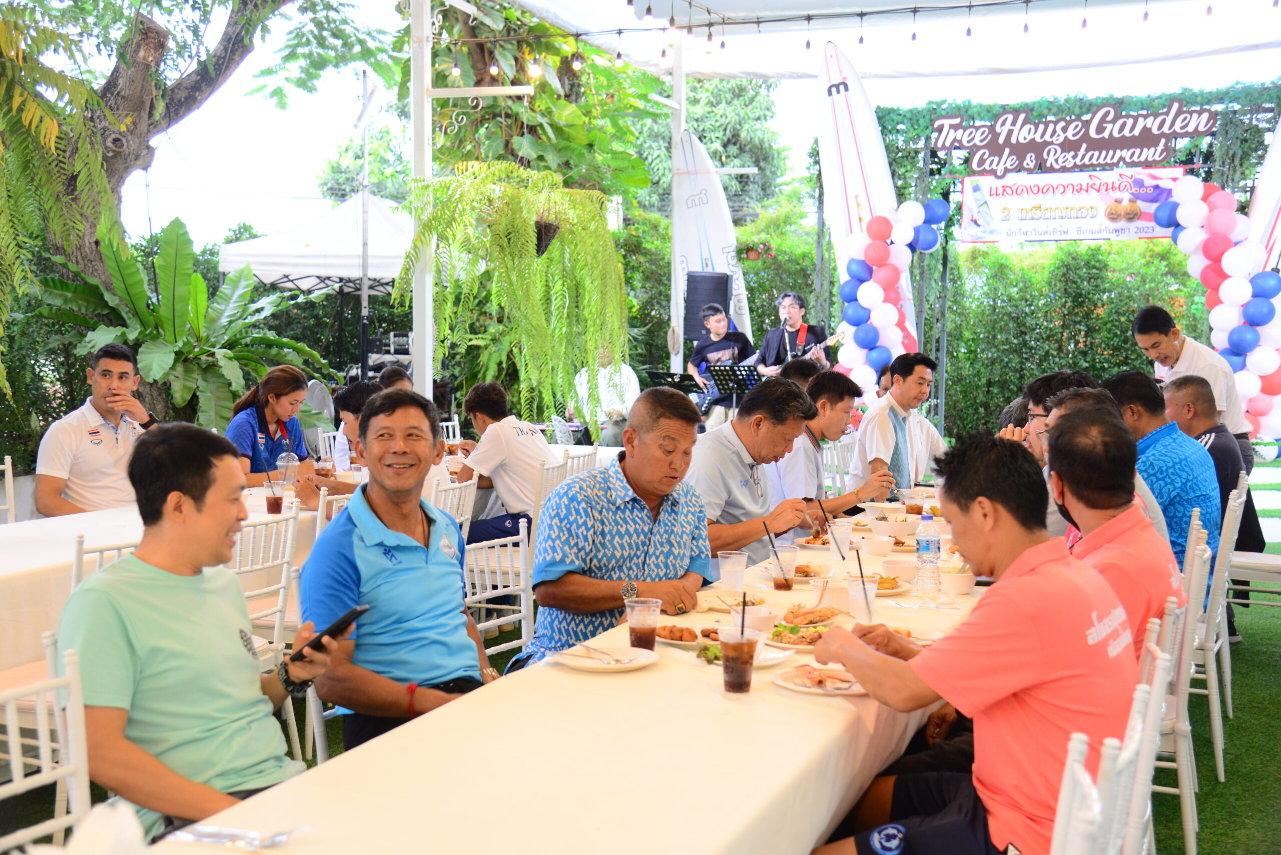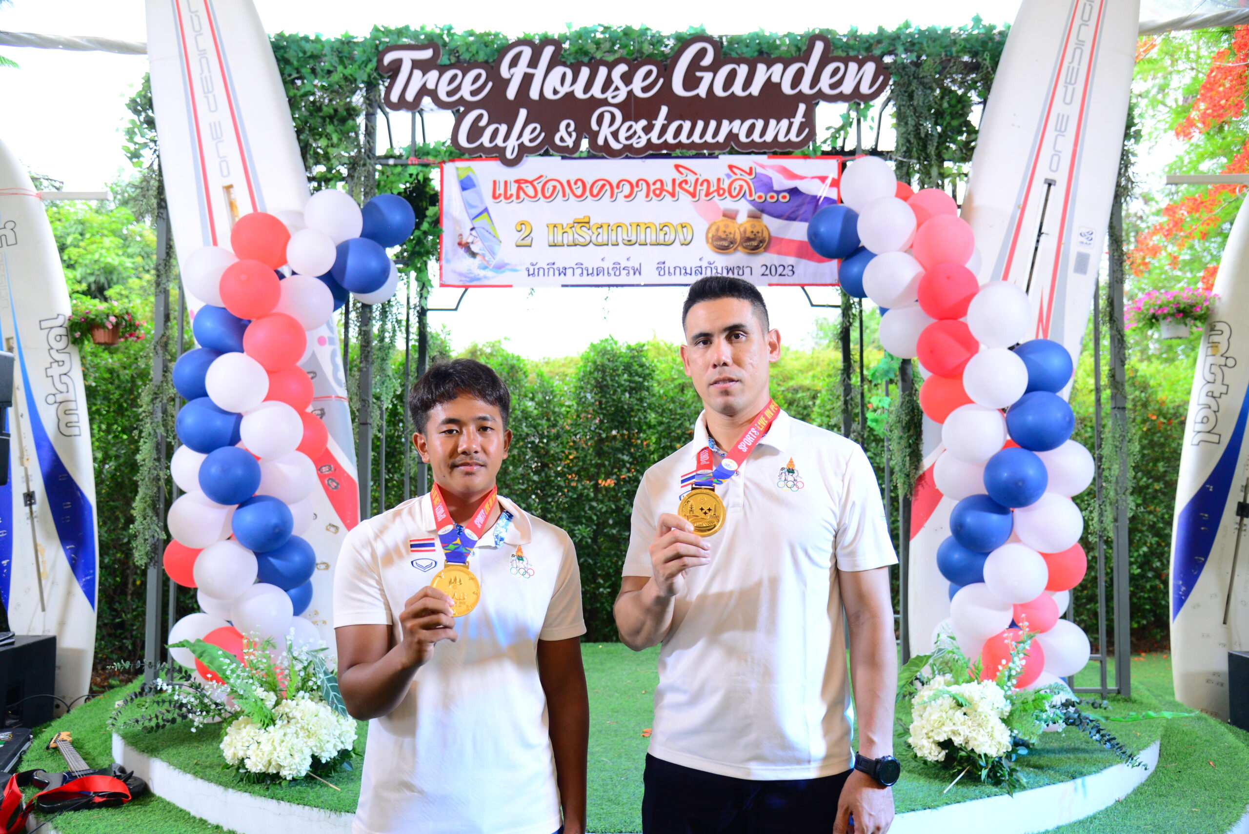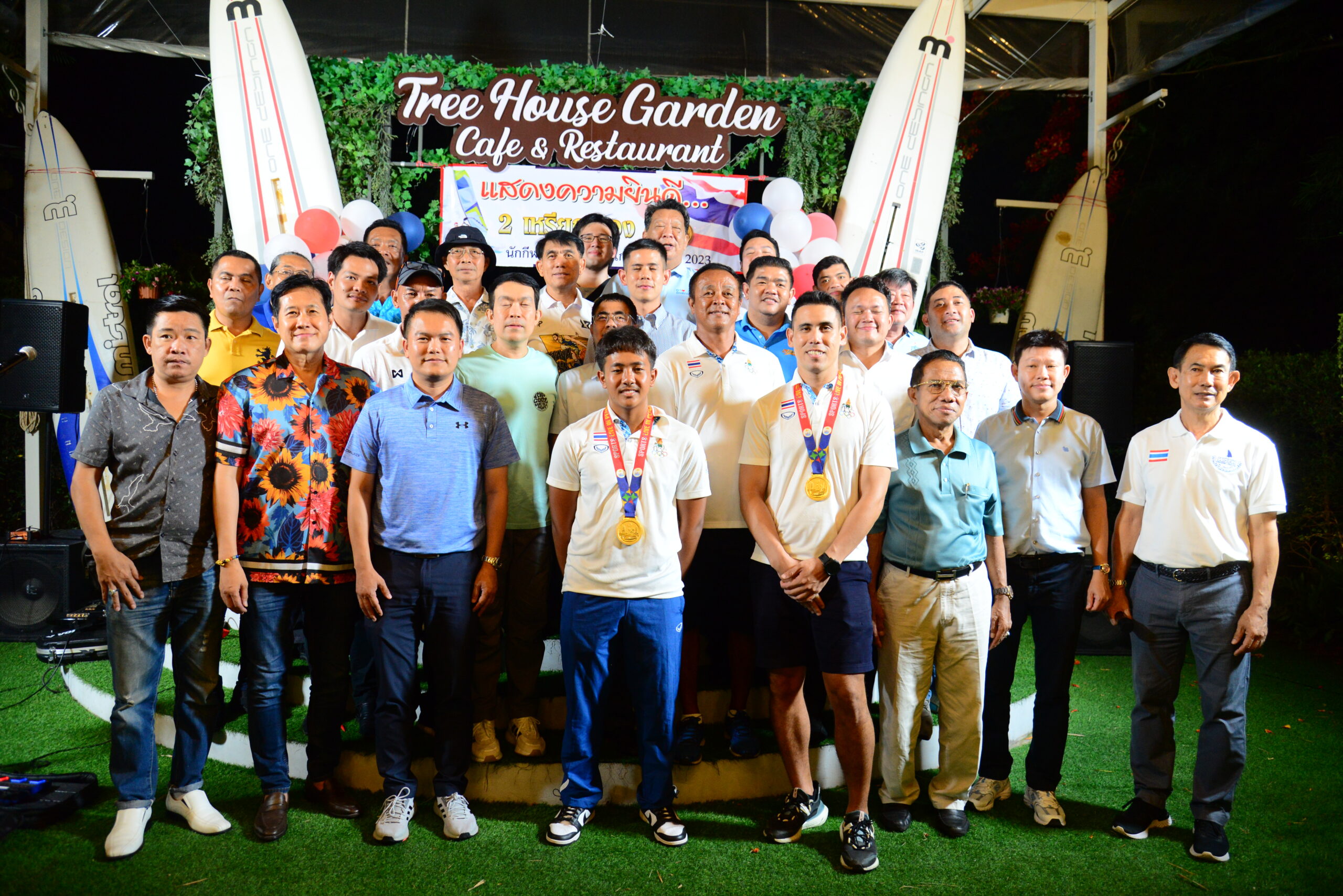 ที่ ร้านทรีเฮ้าส์ การ์เด้น คาเฟ่ ภายในซอยเขามะกอก 9 ต.ห้วยใหญ่ สมาคมสมาคมวินด์เซิร์ฟแห่งประเทศไทย ได้จัดงานเลี้ยงแสดงความยินดี นักกีฬาวินด์เซิร์ฟทีมชาติไทย ที่ คว้า 2 เหรียญทอง ในการแข่งขันกีฬาซีเกมส์ 2023