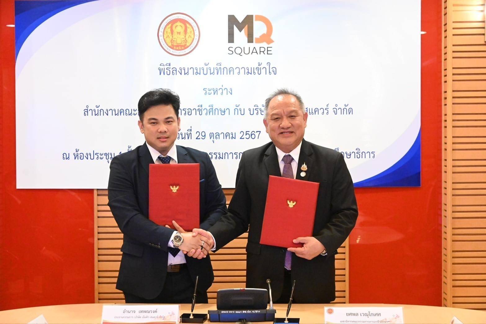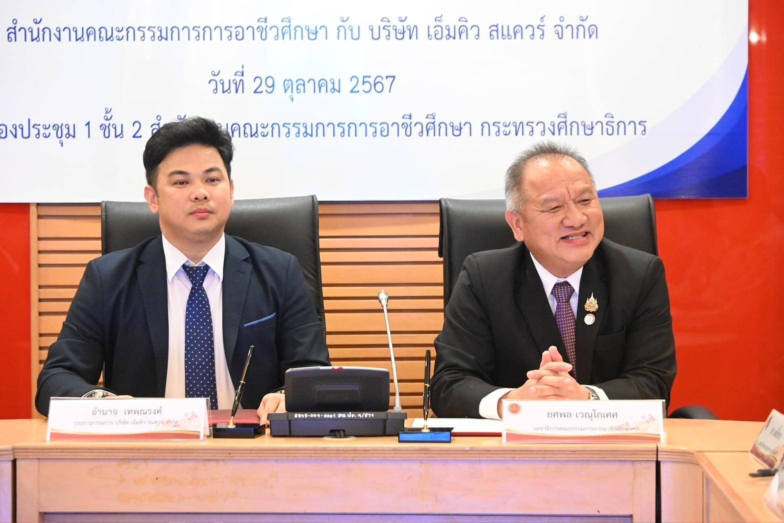 ( 29 ต.ค. 67) นายยศพล เวณุโกเศศ เลขาธิการคณะกรรมการการอาชีวศึกษา ร่วมลงนามบันทึกความเข้าใจ ระหว่าง สำนักงานคณกรรมการการอาชีวศึกษา กับ บริษัท เอ็มคิว สแควร์ จำกัด โดยมี นายอำนาจ เทพณรงค์ ประธานกรรมการบริษัท เอ็มคิว สแควร์ จำกัด ร่วมลงนาม เพื่อจัดกิจกรรมที่ส่งเสริมการเรียนรู้และพัฒนาทักษะด้านยานยนต์และพลังงานใหม่ โดยมีนายสง่า แต่เชื้อสาย ผู้ช่วยเลขาธิการคณะกรรมการการอาชีวศึกษา รักษาราชการรองเลขาธิการคณะกรรมการการอาชีวศึกษา นายธนภัทร แสงจันทร์ ผู้อำนวยการสำนักความร่วมมือ ว่าที่พันตรีวัชรพล ลักษณลม้าย ผู้อำนวยการ(วิทยฐานะเชี่ยวชาญ) วิทยาลัยเทคนิคฉะเชิงเทรา – ผู้อำนวยการสำนักงานอาชีวศึกษาจังหวัดฉะเชิงเทรา – ปฎิบัติหน้าที่ ผู้อำนวยการศูนย์อาชีวศึกษาทวิภาคี สำนักงานคณะกรรมการการอาชีวศึกษา นายศิษฎี ศรคุปต์ ประธานเจ้าหน้าที่บริหาร บริษัท เอ็มคิว สแควร์ จำกัด นายพัฒนพงษ์ ชมภูวิเศษ ที่ปรึกษาด้านผลิตภัณฑ์ บริษัท เอ็มคิว สแควร์ จำกัด เป็นพยาน พร้อมด้วยผู้บริหาร ผู้อำนวยการสถานศึกษา เข้าร่วม ณ ห้องประชุม 1 สำนักงานคณะกรรมการการอาชีวศึกษา
