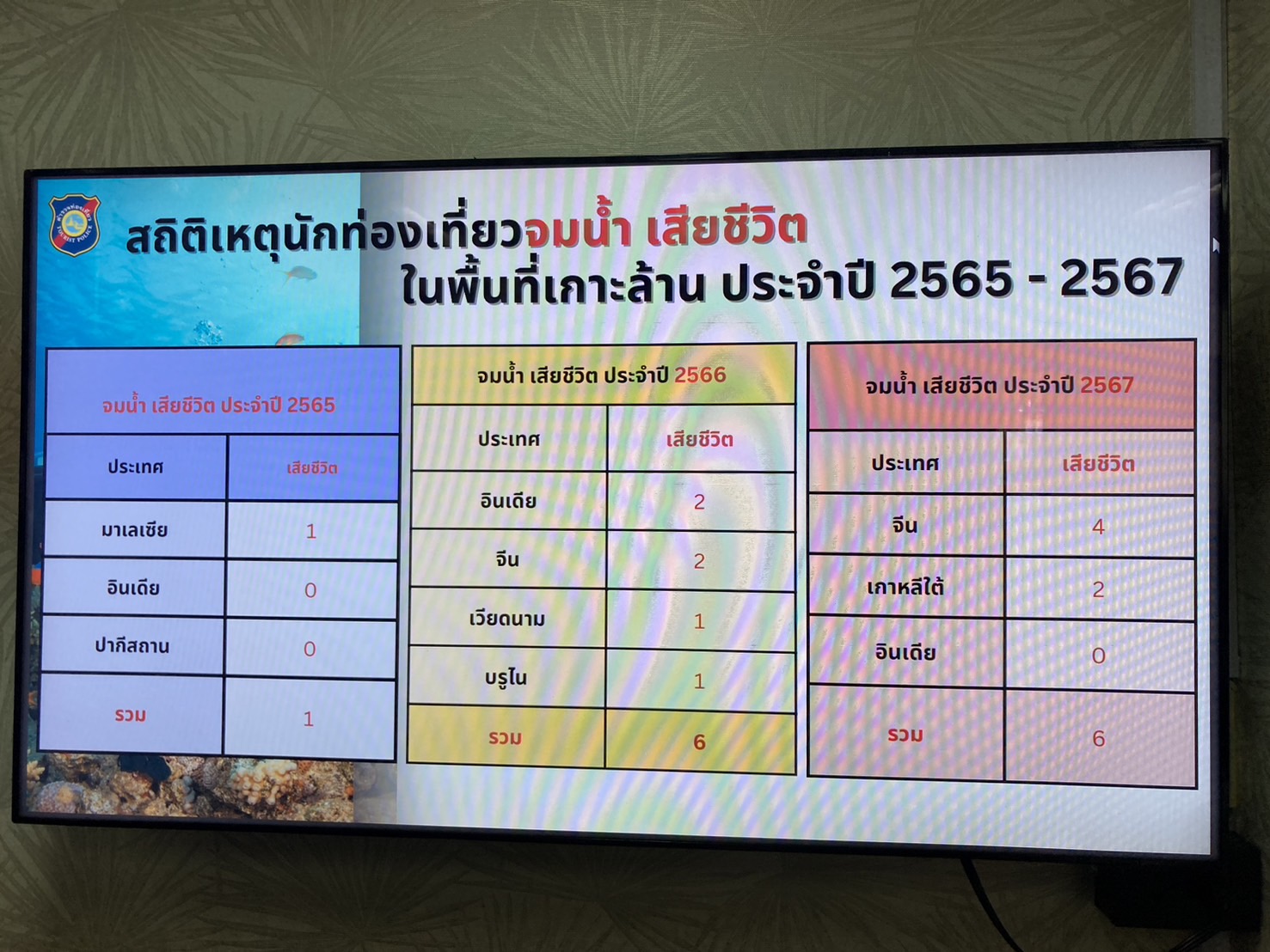 ในที่ประชุมโดย พ.ต.ท.ปิยพงษ์ เอนสาร สวญ.ส.ทท.4 กก.2 บก.ทท.1 ได้นำเสนอข้อมูลด้านการท่องเที่ยวและสถานการณ์ต่างๆ ที่น่าสนใจ โดยพบสถิติเหตุนักท่องเที่ยวจมน้ำเสียชีวิตในพื้นที่เกาะล้าน ประจำปี 2565-2567 โดยพบว่าในระยะเวลา 3 ปี มีนักท่องเที่ยวจมน้ำเสียชีวิตรวม 13 ราย ในปี 2565 มีหนึ่งราย คือนักท่องเที่ยวชาวปากีสถาน ในปี 2566 มี 6 ราย คือ อินเดีย 2 ราย จีน 2 ราย เวียดนาม 1 ราย และบรูไน 1 ราย และในปี 2566 มี 6 ราย คือ จีน 4 ราย และเกาหลีใต้ 2 ราย ซึ่งพบว่าผู้เสียอายุเป็นคนชราและผู้สูงวัย