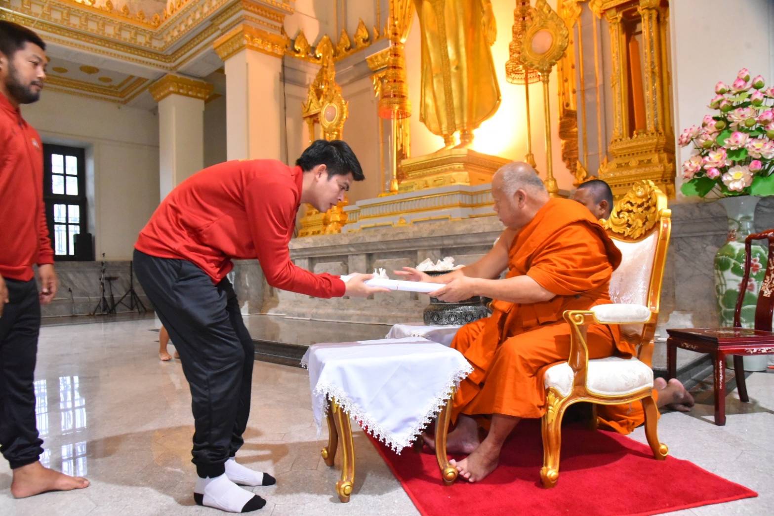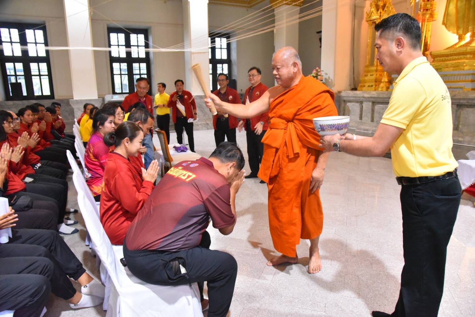 หลังจากนั้น พระเทพภาวนาวชิรคุณ วิ. เจ้าอาวาสวัดโสธรวราราม วรวิหาร เจ้าคณะจังหวัดฉะเชิงเทรา ได้ทำการรดน้ำมนต์ให้แก่คณะผู้บริหารจังหวัด คณะนักกีฬาและเจ้าหน้าที่ รวมถึงผู้เกี่ยวข้องที่เข้าร่วมในพิธี และได้มอบของที่ระลึกเพื่อเสริมสร้างขวัญและกำลังใจก่อนที่จะเดินทางเข้าร่วมการแข่งขัน