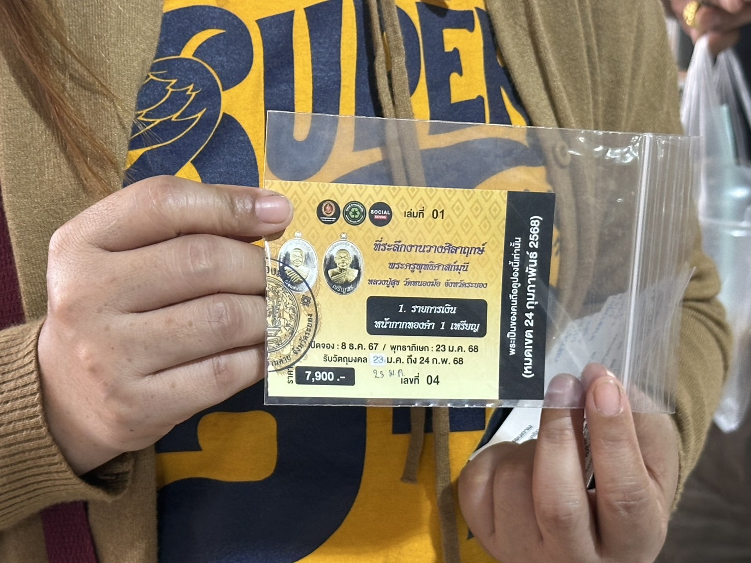 โดยศิษยานุศิษย์ที่ศรัทธาในตัวหลวงปู่ทองสุขรายหนึ่ง จับสลากใบจองเหรียญได้เนื้อเงินหน้ากากทองคำ ราคา 7,900 บาท ซึ่งเป็นเหรียญที่ราคาสูงที่สุด บอกว่า ดีใจที่จับได้เหรียญเนื้อดังกล่าว ซึ่งมีเซียนพระขอซื้อใบจองให้ราคา 2,000 บาท แต่ไม่ขายจะเก็บไว้เอง เพื่อมารับเหรียญวัตถุมงคลในวันที่ทางผู้จัดสร้างนัดมารับ ก่อนอัดกรอบขึ้นคอ เพื่อความเป็นสิริมงคลต่อไป