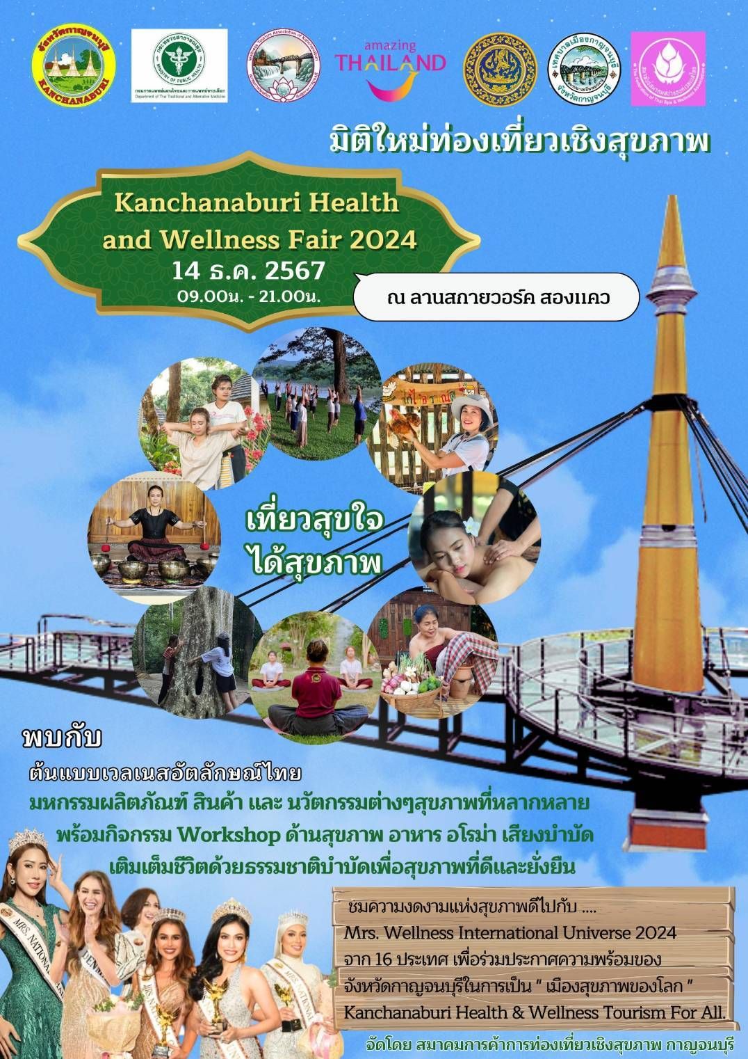 นายกสมาคมการค้าการท่องเที่ยวเชิงสุขภาพกาญจนบุรี พาณิชย์จังหวัดกาญจนบุรี การท่องเที่ยวแห่งประเทศไทย สำนักงานกาญจนบุรี พัฒนาชุมชนจังหวัด คณะกรรมการสมาคมฯ นายกสมาพันธ์สมาคมสปา&เวลเนส ผู้แทนหน่วยงานและองค์กรต่างๆ และ Mrs.Wellness International Universe2024 จาก 16 ประเทศ จาก 16 ประเทศ ร่วมพิธีเปิดและถ่ายทำVTR บนสกายวอล์คกาญจนบุรี ประกาศความพร้อมของจังหวัดกาญจนบุรีในการเป็น “เมืองสุขภาพของโลก” Kanchanaburi Health & Wellness Tourism For All “Travel with Joy, Embrace Wellness” เที่ยวสุขใจ ได้สุขภาพ กาญจนุบรีประกาศความพร้อมเป็นเมืองสุขภาพของโลก ในงาน Kanchanaburi Health and Wellness Fair พร้อมรับคณะ Mrs.Wellness International Universe 2024 จาก 16 ประเทศ รวมหน่วยงานภาครัฐ องค์กรภาคเอกชน ผู้ประกอบการและผู้เชี่ยวชาญด้านสุขภาพในทุกมิติ 14 ธ.ค.นี้ ณ จุดท่องเที่ยวสกายวอล์ค ริมน้ำสองแควเมืองกาญจนบุรี