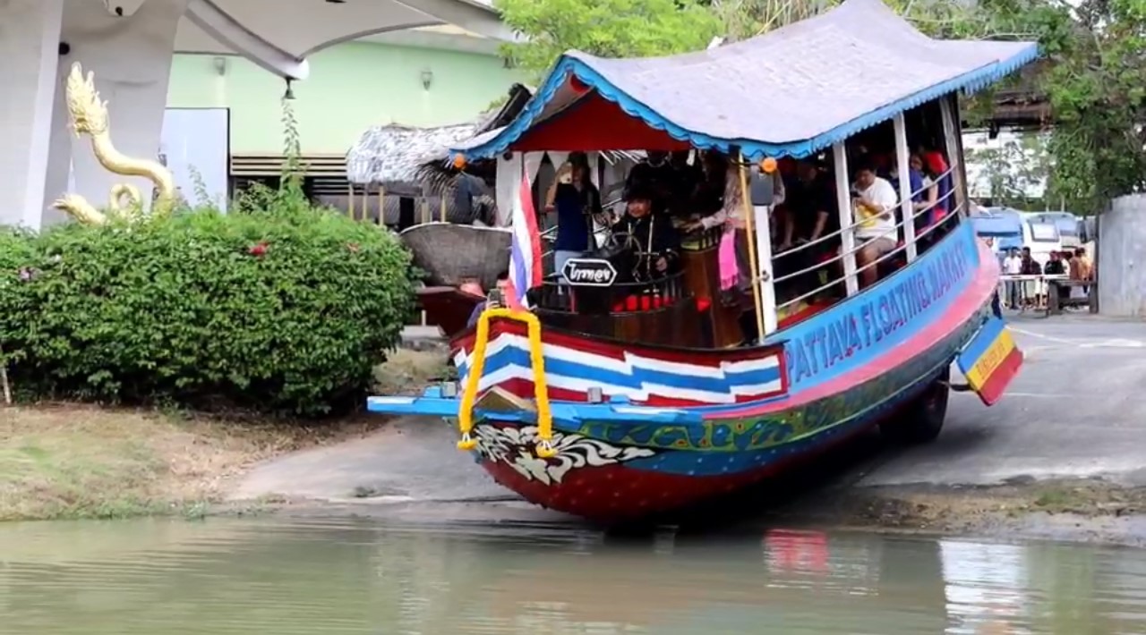 มีรายงานว่า ตลาดน้ำ 4 ภาคพัทยา สถานที่ท่องเที่ยวชื่อดังจังหวัดชลบุรี ได้เปิดให้บริการ “เรือสะเทินน้ำ สะเทินบก” หนึ่งเดียวในประเทศไทย