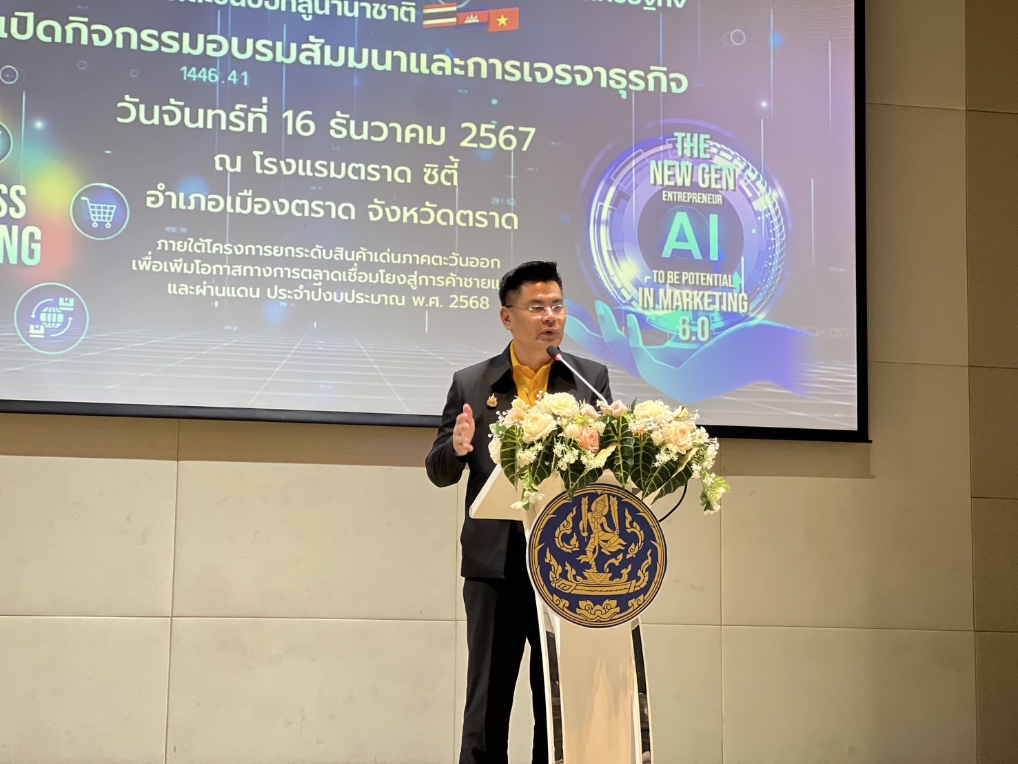 จ.ตราด/เวลา 13.00 น.วันที่ 16 ธันวาคม 2567 ที่โรงแรมตราดซิตี้ อำเภอเมืองตราด จังหวัดตราด นายพีระ เอี่ยมสุนทร รองผู้ว่าราชการจ.ตราด กล่าวต้อนรับนายวัฒนศักดิ์ เสือเอี่ยม ผู้ตรวจราชการกระทรวงพาณิชย์ ที่เดินทางมาเป็นประธานเปิดงาน เสริมสร้างศักยภาพและเชื่อมโยงเศรษฐกิจระเบียงเศรษฐกิจภาคตะวันออกสู่นานาชาติ ภายใต้โครงการยกระดับสินค้าเด่นภาคตะวันออกเพื่อเพิ่มโอกาสทางการตลาดเชื่อมโยงสู่การค้าชายแดน ประจำปีงบประมาณ พ.ศ. 2568 ซึ่งสำนักงานพาณิชย์จังหวัดตราด โดยนางวรัญญา ถนอมพันธ์ พาณิชย์จ.ตราด เป็นเจ้าภาพจัดขึ้น มีพาณิชย์จังหวัดในภาคตะวันออกร่วมอบรมพร้อมผู้ประกอบการในจังหวัดตราด และจังหวัดในภาคตะวันออกร่วมกว่า 120 คน