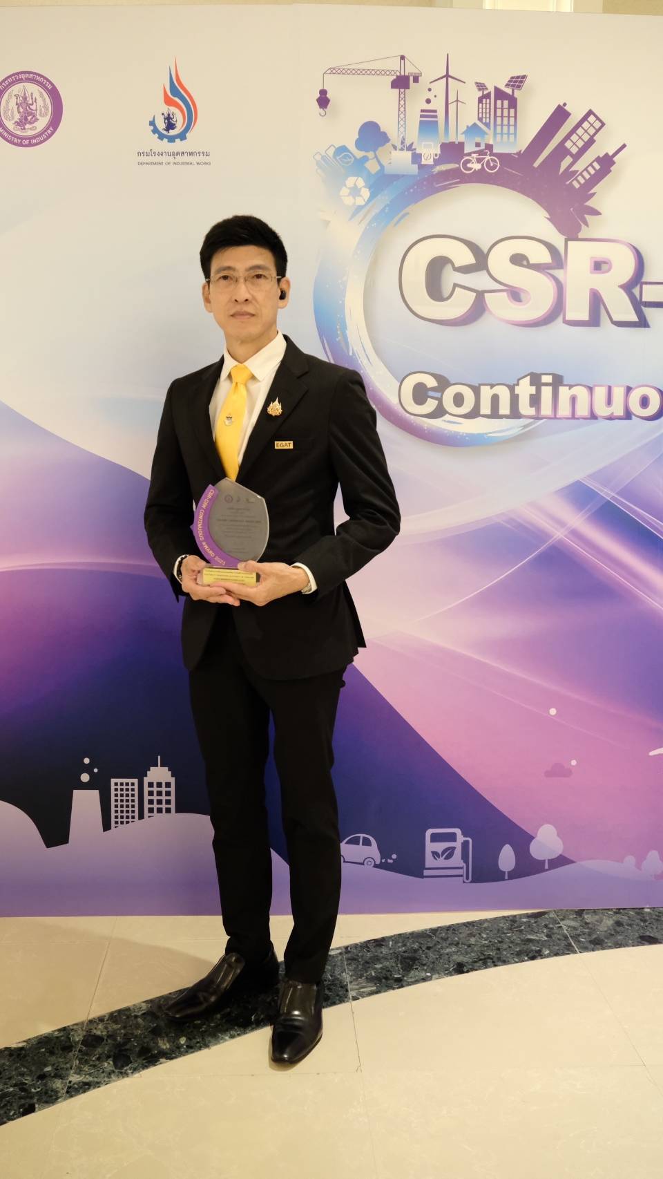 นายสาโรช กิจประเสริฐ ผู้อำนวยการโรงไฟฟ้าบางปะกง เป็นผู้แทน การไฟฟ้าฝ่ายผลิตแห่งประเทศไทย (กฟผ.) โรงไฟฟ้าบางปะกง รับรางวัลเกียรติยศ CSR-DIW Continuous 10 ปีต่อเนื่อง จาก นายเอกนัฏ พร้อมพันธุ์ รัฐมนตรีว่าการกระทรวงอุตสาหกรรม จัดโดยกรมโรงงานอุตสาหกรรม กระทรวงอุตสาหกรรม ณ ห้องรอยัล จูบิลี่ บอลรูม อาคารชาเลนเจอร์ อิมแพ็ค เมืองทองธานี จังหวัดนนทบุรี ชูความสำเร็จสามารถรักษามาตรฐานความรักษามาตรฐาน CSR-DIW ต่อเนื่อง (CSR-DIW Continuous) เป็นปีที่ 13 มุ่งสู่การพัฒนาอย่างยั่งยืนตอบสนองนโยบายของ กฟผ. และ กระทรวงอุตสาหกรรม ที่ให้ความสำคัญในการส่งเสริมและสนับสนุนชุมชนในพื้นที่สู่การสร้างงานสร้างอาชีพ สร้างรายได้ โดยการนำนโยบายโรงงานอยู่คู่ชุมชนอย่างยั่งยืนมาประยุกต์เป็นกิจกรรมที่ส่งเสริมความสัมพันธ์อันดีระหว่างโรงงานอุตสาหกรรมและชุมชน ภายใต้การยกระดับภาคอุตสาหกรรมสู่มาตรฐานความรับผิดชอบต่อสังคมของกรมโรงงานอุตสาหกรรม หรือ CSR-DIW (Corporate Social Responsibility-Department of Industrial Works) มุ่งเน้นในเรื่อง สังคม สิ่งแวดล้อม และธรรมาภิบาลองค์กร สร้างความไว้ใจและเชื่อมั่นในการประกอบกิจการต่อผู้มีส่วนได้เสีย ทั้งพนักงานโรงงาน คู่ค้า ผู้บริโภค ชุมชน และหน่วยงานกำกับดูแล สร้างสังคมการทำงานที่ดีช่วยเสริมสร้างภาพลักษณ์ที่ดีแก่โรงงานอุตสาหกรรมและภาคอุตสาหกรรมไทย