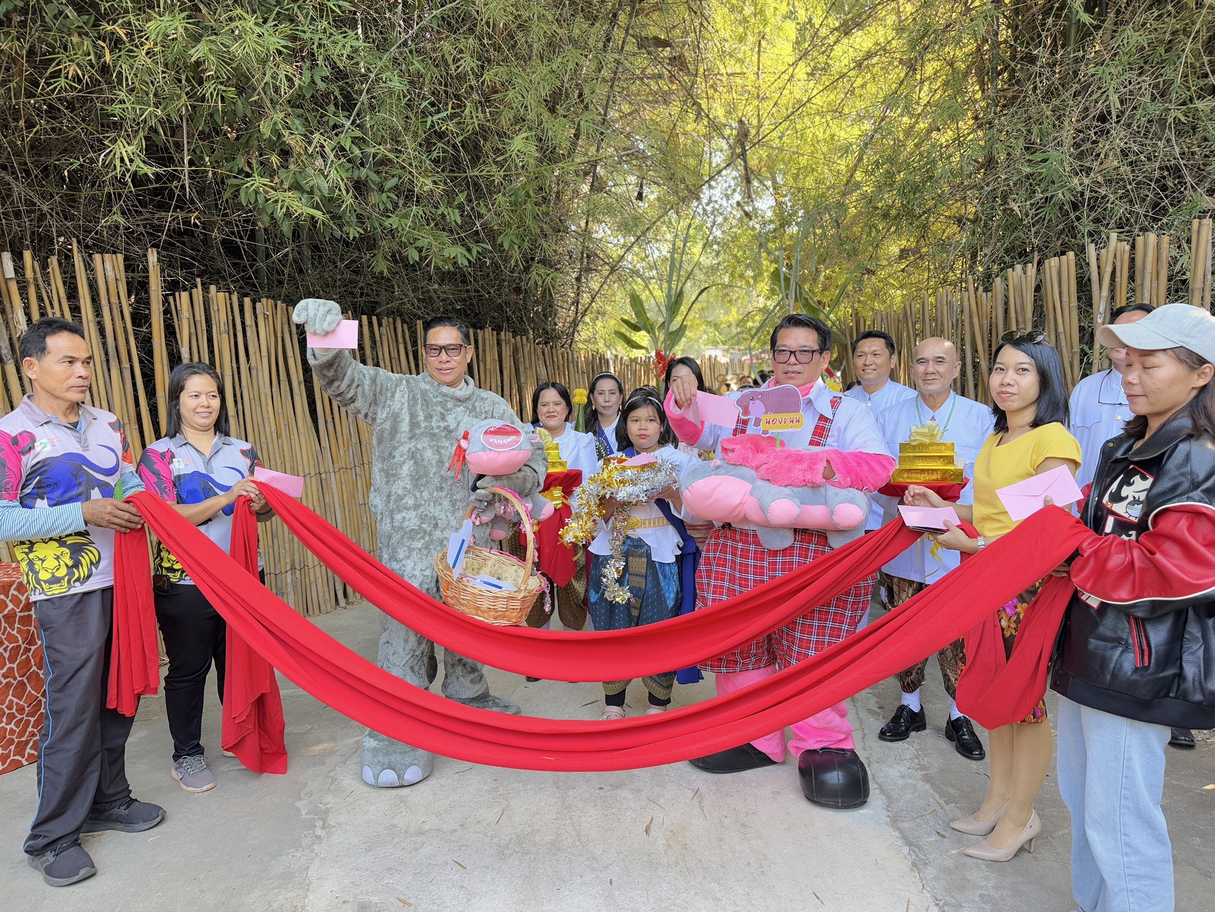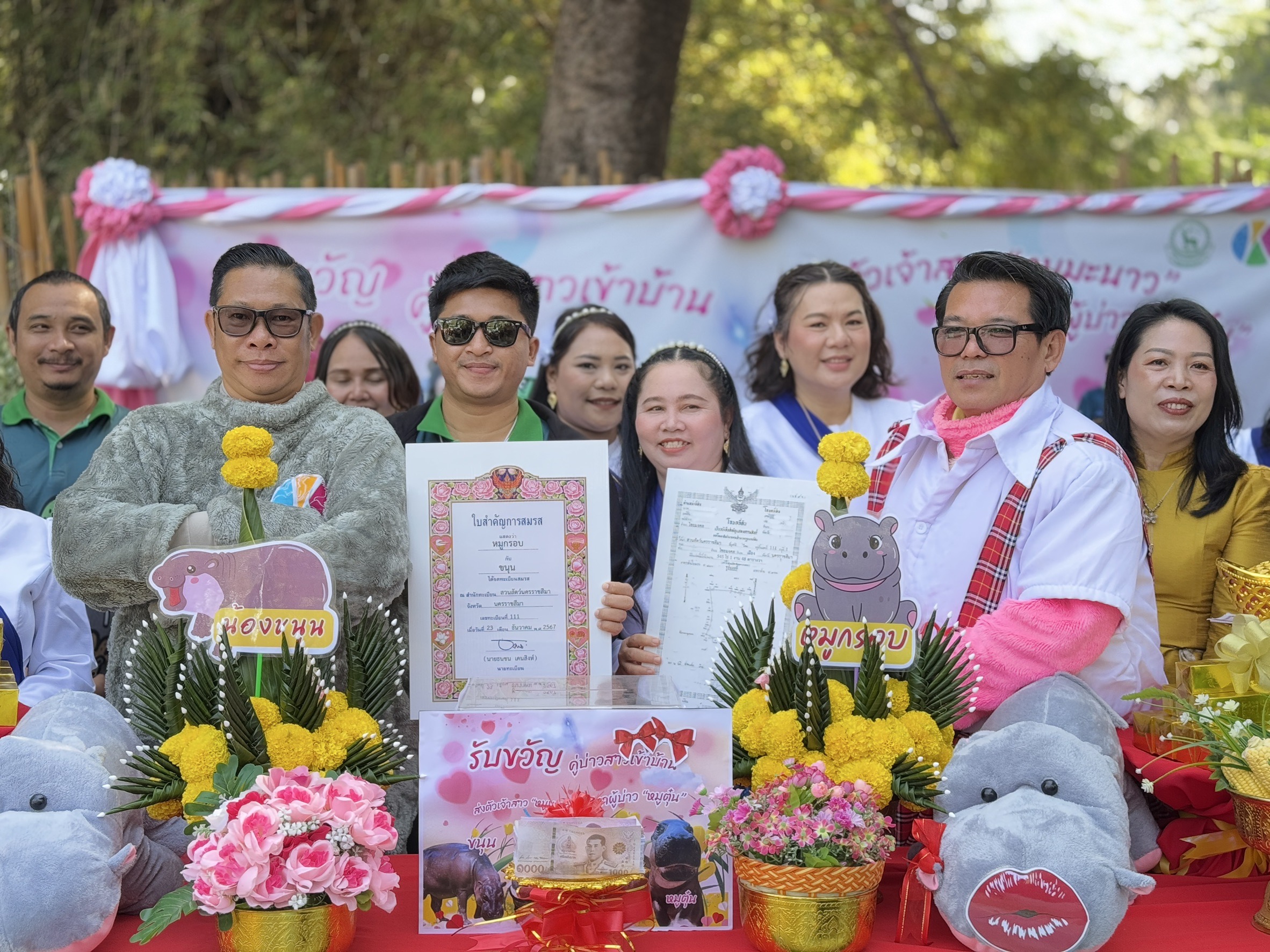 วันที่ 23 ธันวาคม 2567 ที่สวนสัตว์นครราชสีมา จัดพิธีสู่ขอหมูมะนาว ฮิปโปแคะสาวเป็นสะใภ้หมูตุ๋นพี่ชายหมูเด้งที่สวนสัตว์เปิดเขาเขียว จ.ชลบุรี โดย นายณรงวิทย์ ชดช้อย ผู้อำนวยการสวนสัตว์เปิดเขาเขียว และนายธนชน เคนสิงห์ ผู้อำนวยการสวนสัตว์นครราชสีมา นำขบวนขันหมากสินสอดอย่างสวยงาม เพิ่มสีสันด้วยการจัดโฉนดที่ดินสวนสัตว์ เงินทองสินสอด (เงินทองจำลอง) แบบทุ่มสุดตัว บรรยากาศเต็มไปด้วยความชื่นมื่น พร้อมด้วยเจ้าหน้าที่ผู้ดูแลสวนสัตว์เข้าร่วมพิธี พร้อมทั้งมีเยาวชนนักเรียนเข้าชมอย่าคึกคัก