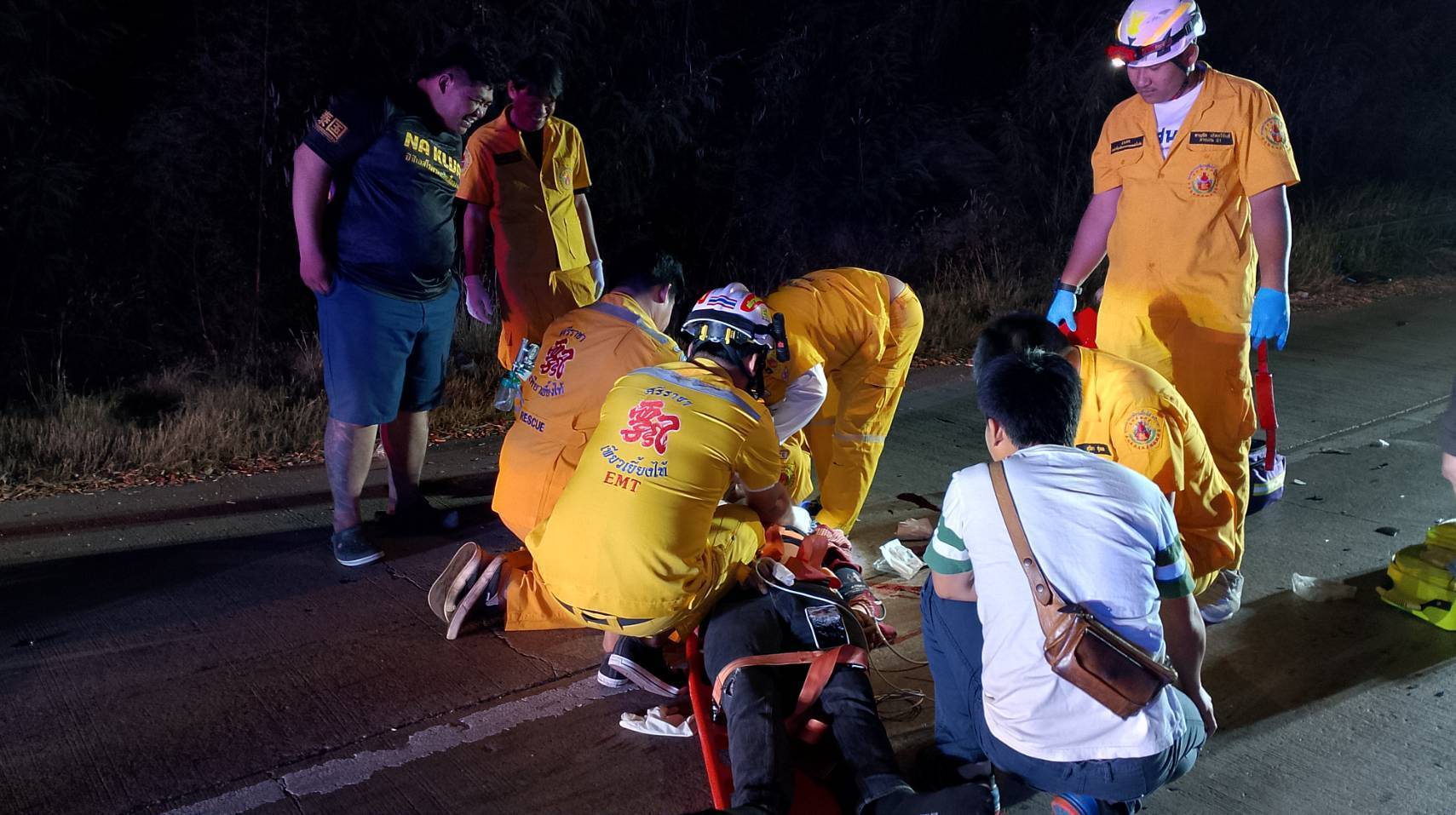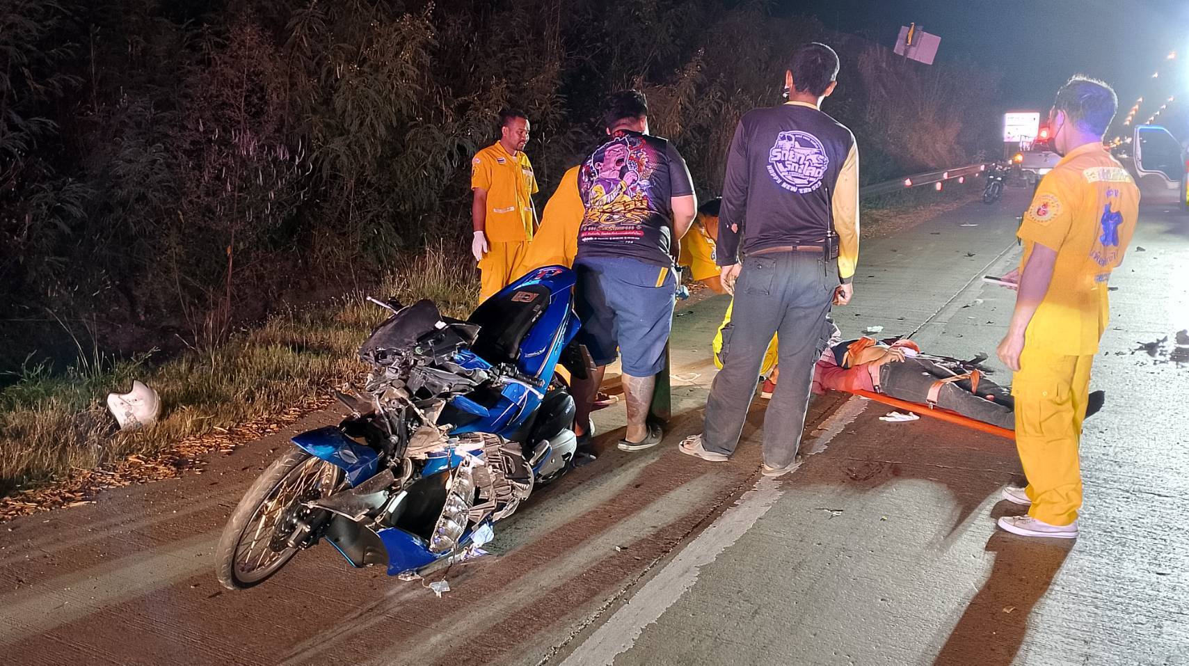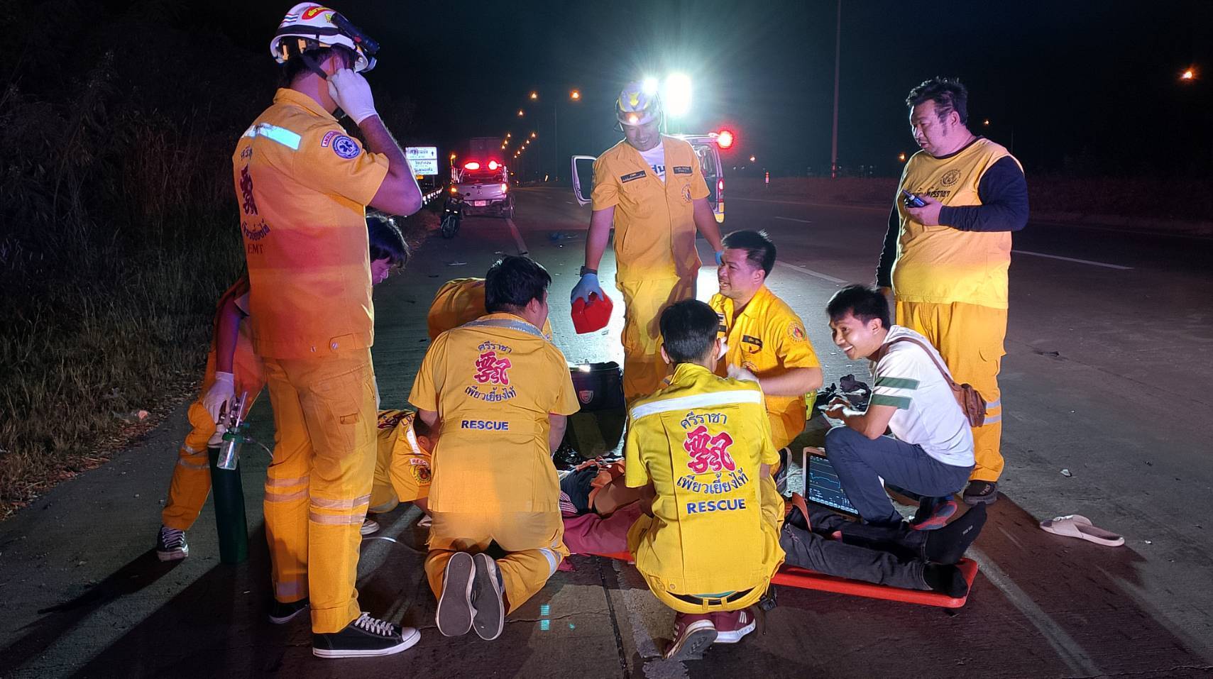จึงประสานรถกู้ชีพลั่นทม โรงพยาบาสมเด็จพระบรมราชเทวี ณ ศรีราชา ส่งทีมแพทย์-พยาบาลออกมารับตัวผู้บาดเจ็บสาหัส โดยในเบื้องต้นทางกู้ภัยพบบาดแผลขนาดใหญ่ที่หน้าผากและศรีษะจึงทำการปฐมพยาบาลและทำพีซีอาร์เพื่อกระตุ้นรวมถึงให้ออกซิเจน แก่ผู้บาดเจ็บเนื่องจากหายในรวยรินหมดสติ ใกล้กันพบรถจยย.ฮอนด้าPCX สีน้ำเงิน สภาพรถด้านหน้าพังยับเยินจนตัวรถย่นพับงอ ซึ่งเป็นรถจยย.ที่ผู้บาดเจ็บสาหัสขี่มา