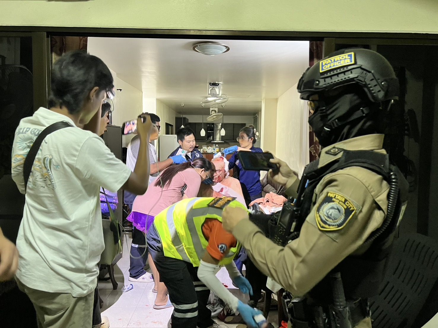 ที่เกิดเหตุภายในบ้านพักพบMR.RICHARD ANDER M. VAN BOGAERT อายุ 80 ปี อดีตช่างไฟสัญชาติเบลเยี่ยม อยู่ในสภาพเลือดอาบโชกไปทั่วร่างกาย มีบาดแผลฉีกขาดถูกของมีคมฟันเข้าที่ศีรษะ เจ้าหน้าที่กู้ภัยฯให้การช่วยเหลือปฐมพยาบาลเบื้องต้น ก่อนเคลื่อนย้ายส่งโรงพยาบาลอย่างเร่งด่วน ตรวจสอบพบทรัพย์สินเป็นกระเป๋าเงิน ซึ่งภายในมีเงินอยู่ประมาณ 7,000 บาท สูญหายไป