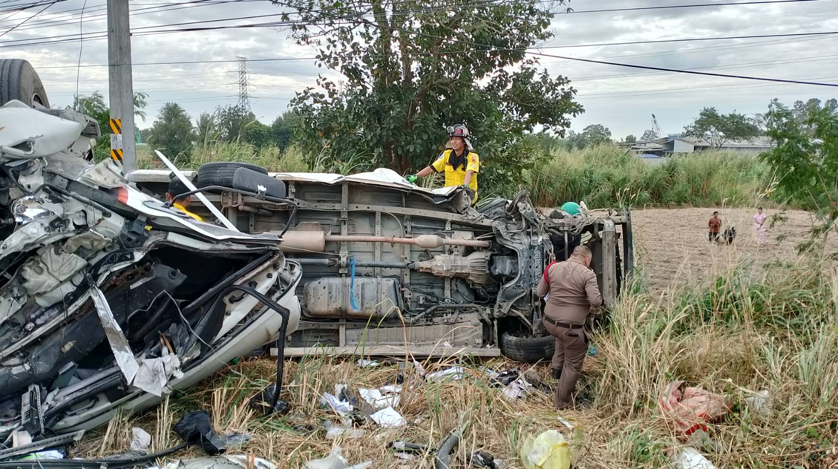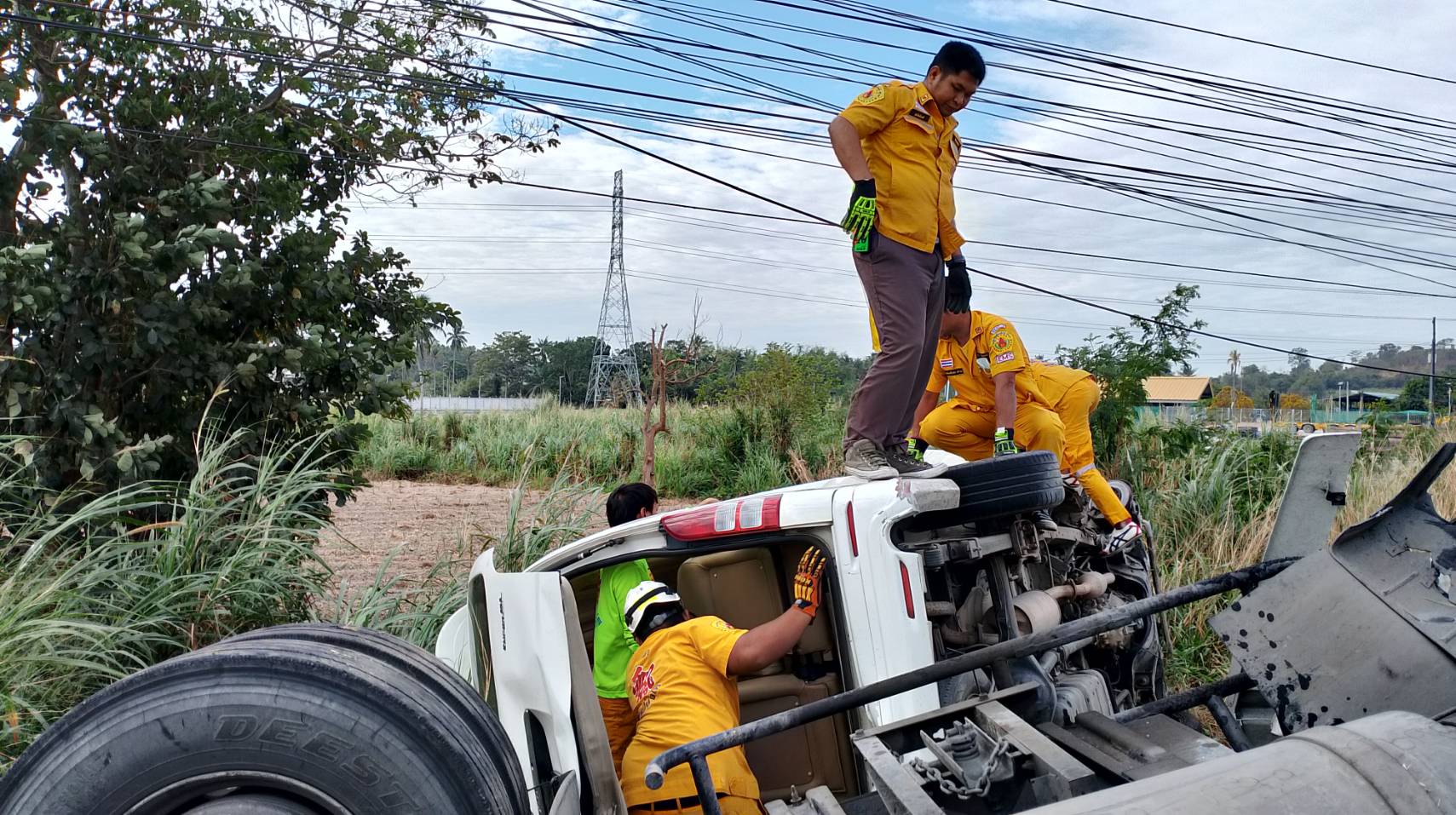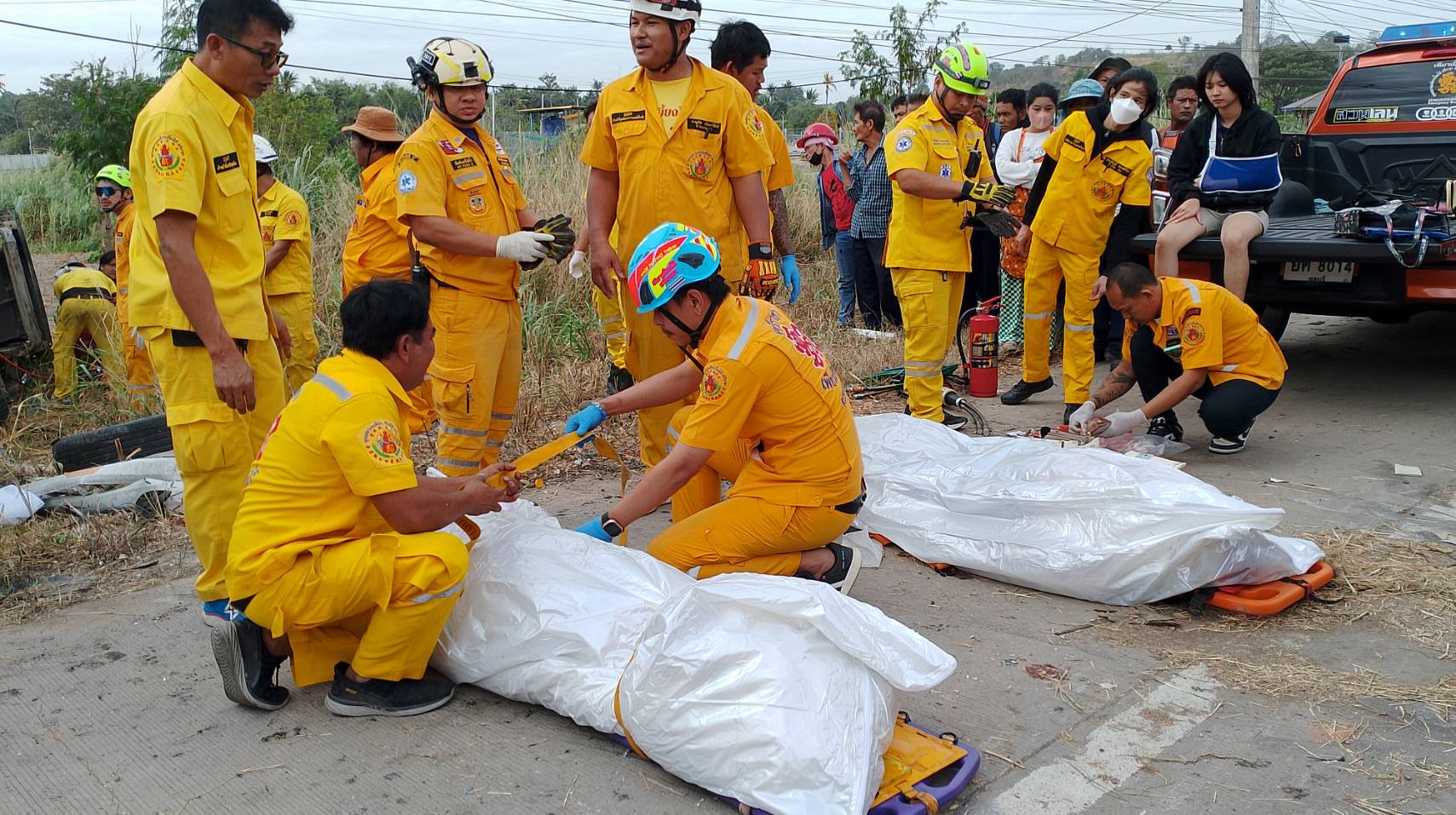 โดยได้รับบาดเจ็บที่ศีรษะและขาขวาผิดรูปทางกู้ภัยรีบนำส่งรักษาตัวทีโรงพยาบาลแหลมฉบัง หลังจากนั้นทางอาสาหน่วยกู้ภัยได้นำเครื่องตัดถ่างตัดบริเวณรถตู้เพื่อนำศพของนางสาววรรณภา(ขอสงวนนามสกุล)อายุ 42ปี ซึ่งนั้งข้างคนขับออกมาเป็นศพแรกพบว่าสภาพศพศีรษะแตกกระจายสมองไหลออกมา และศพที่สองนายปรีชา(ขอสงวนนามสกุล) อายุ 49 ปีคนขับรถตู้สภาพศพคอหัก ช่วงเท้าซ้ายขาดกระจุยตกอยู่ในรถ โดยทั้ง2คนเป็นผัวเมียกัน โดยทางตำรวจได้ให้หน่วยกู้ภัยนำศพผู้เสียชีวิตทั้ง2ศพส่งโรงพยาบาลแหลมฉบังเพื่อรอญาติมารับศพไปบำเพ็ญกุศลต่อไป ทางเจ้าหน้าทีตำรวจสอบสวนทราบว่ารถพ่วง18ล้อนั้นขับมาตามถนนสายแหลมฉบัง-มาบเอียงเมื่อวิ่งมาถึงหน้านิคอุตสาหกรรมWHA2 ก็เสียหลักพุ่งข้ามเกาะกลางถนนมาชนเสาไฟฟ้าส่องสว่างที่เกาะกลางถนน ก่อนุพ่งชนกับรถตู้ที่วิ่งสวนทางมาจนมีผู้เสียชีวิตคารถ2ศพดังกล่าว ซึ่งหลังจากคนขับรถพ่วง18ล้อออกจากโรงพยาบาลจะดำเนินการสอบสวนหาสาเหตุที่แท้จริงต่อไป