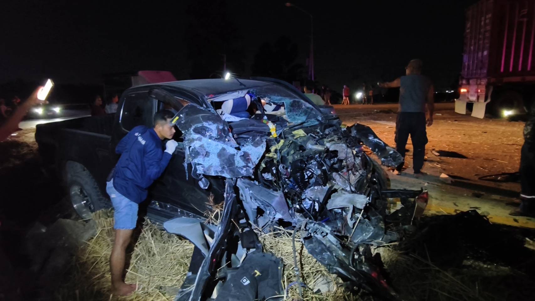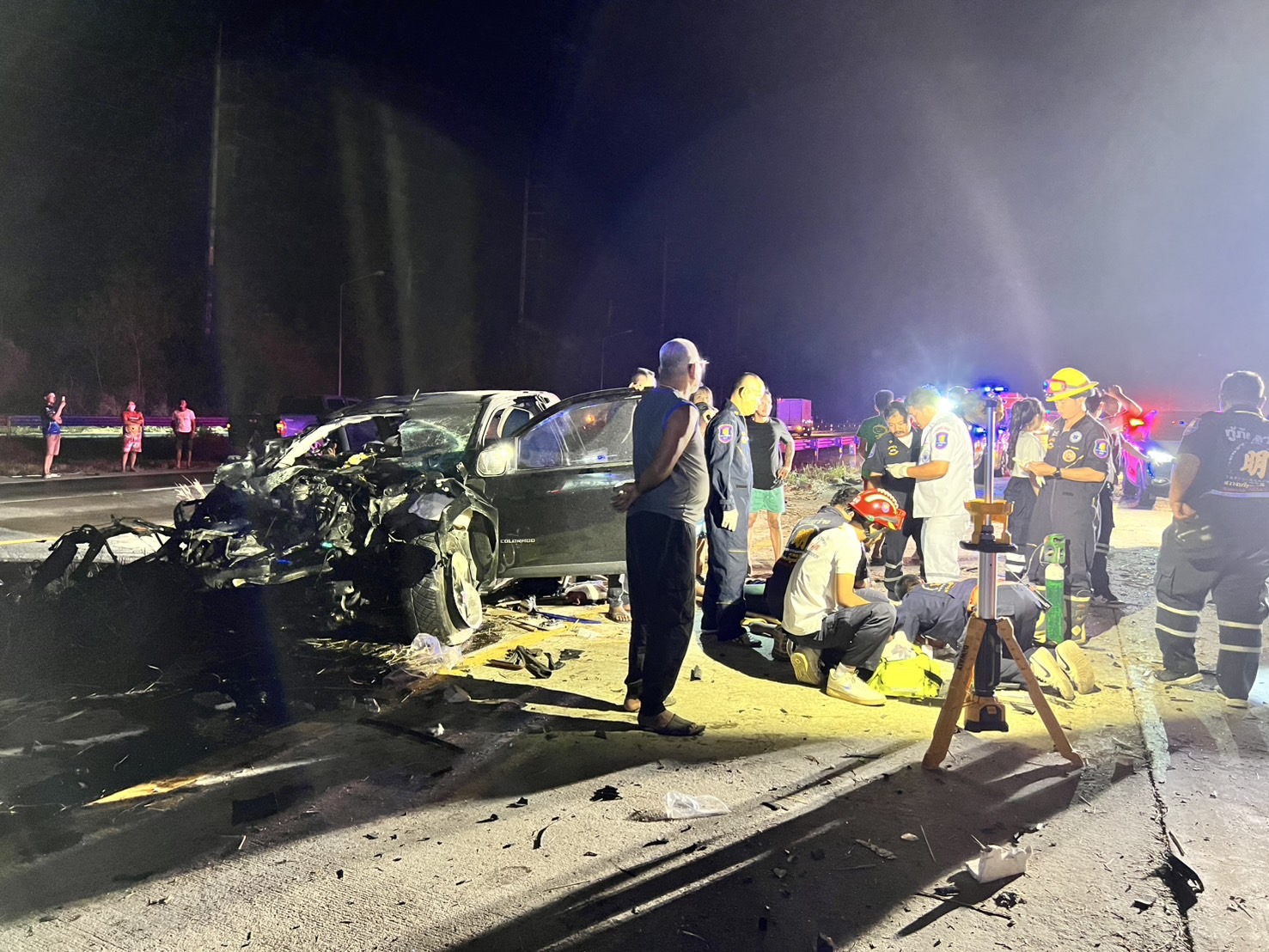 ที่เกิดเหตุพบรถยนต์กระบะยี่ห้อเชฟโลเลต โคโลราโด้ สีดำ เสียหลัก หมุนเขว้งอยู่ที่เกาะกลาง ได้รับความเสียหายยับเยิน มี นาย ธีรภัทร อายุ 21 ปี เป็นคนขับได้รับบาดเจ็บสาหัสติดอยู่ภายในซากรถ เจ้าหน้าที่กู้ภัยฯให้การปฐมพยาบาลเบื้องต้น ปั้มหัวใจเพื่อยื้อชีวิต ก่อนจะเคลื่อนย้ายส่งโรงพยาบาลอย่างเร่งด่วน