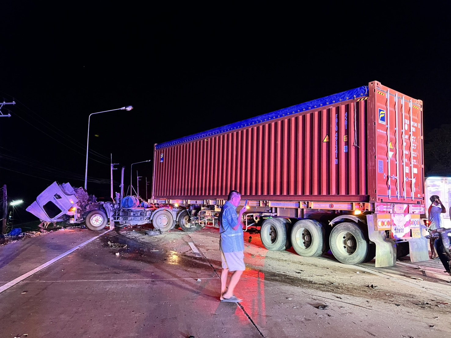 คันที่สามเป็นพ่วง 18 ล้อ ของบริษัทเอแอนด์ โอเค ทรานสปอร์ต เสียหลักตกลงไปไหลทางริมถนน จนได้รับความเสียหาย ส่วนตัวพ่วงจอดขวางถนนในช่วงเส้นคู่ขนานทั้ง 3 เลน ภายในซากรถยังพบ นายลิขิต อายุ 31 ปี ได้รับบาดเจ็บเล็กน้อย และ น.ส.อนงค์นาถ อายุ 28 ปี แฟนสาวได้รับบาดเจ็บสาหัส เจ้าหน้าที่กู้ภัยฯปฐมพยาบาลเบื้องต้น ก่อนเคลื่อนย้ายส่งโรงพยาบาลเช่นกัน