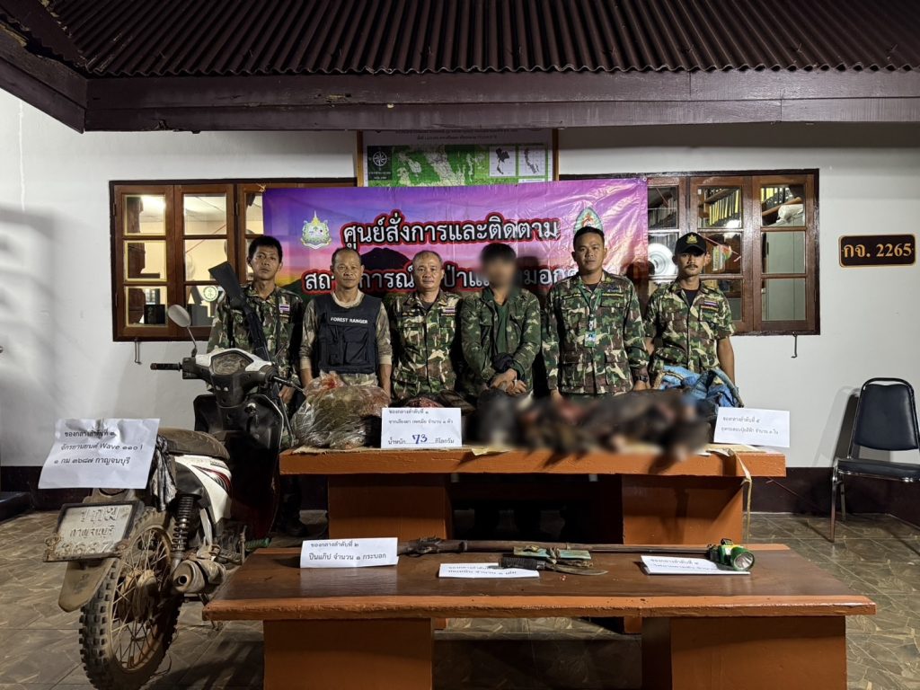 จับสิ้นปี…นึกว่าจนท.หยุดปีใหม่ กะเหรี่ยงแสบลอบเข้าป่าอช.ทองผาภูมิ ยิงเลียงผาสัตว์ป่าสงวนหายาก โดนรวบพร้อมของกลางปืน และซากเลียงผาขนาดใหญ่