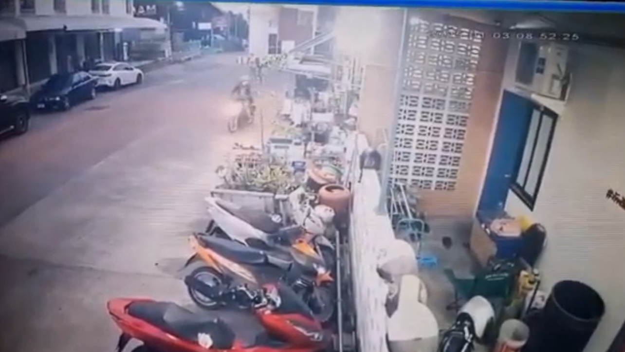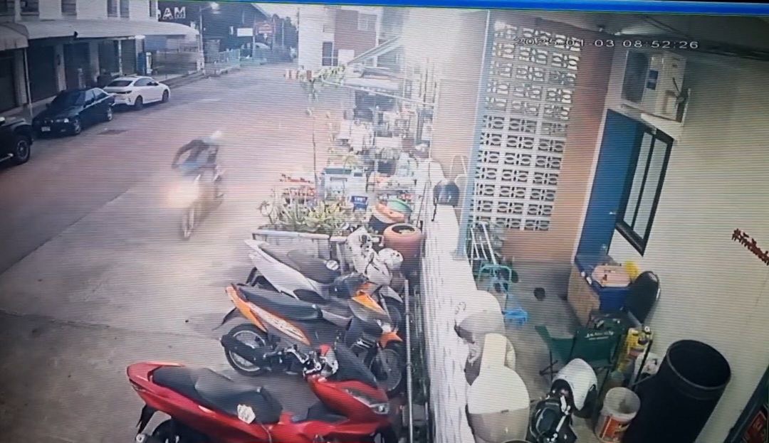ส่วนกล้องวงจรปิดที่อยู่บริเวณด้านหลัง สามารถจับภาพคนร้าย สวมเสื้อผ้ามิดชิดสวมหมวดกันน็อคเต็มใบขับขี่รถ จยย.แบบผู้หญิงออกมุ่งหน้าไปทางซอยเพนียดช้าง