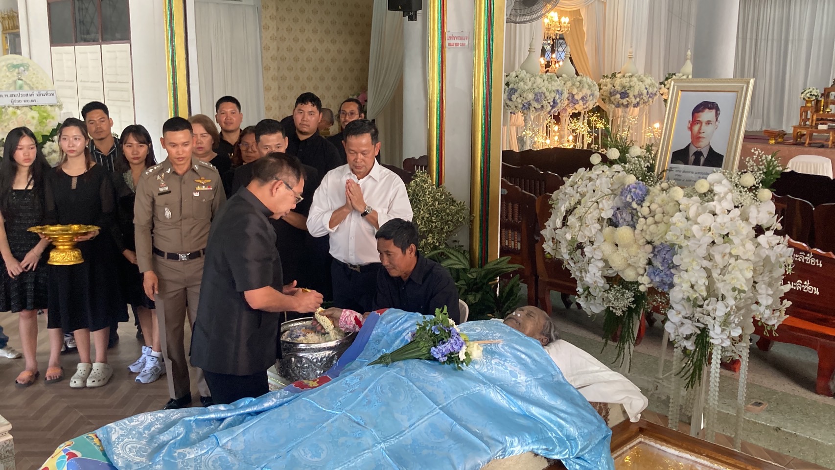วันที่ 6 ม.ค.68 ที่ศาลา 2 วัดหนองใหญ่ เมืองพัทยา จ.ชลบุรี ครอบครัวแหวนประดับ โดย พ.ต.อ.นิทัศน์ แหวนประดับ ผกก.ปพ.สส.ภ.2 ให้การต้อนรับ พล.ต.ท.อิทธิพล พิริยภิญโญ อดีตผู้บัญชาการประจำสำนักงานผู้บัญชาการตำรวจแห่งชาติ ในโอกาสเดินทางมาเป็นประธานในพิธีรดน้ำศพ คุณพ่อสงคราม แหวนประดับ อายุ 83 ปี ที่เสียชีวิตด้วยโรคประจำตัวและความชราภาพ