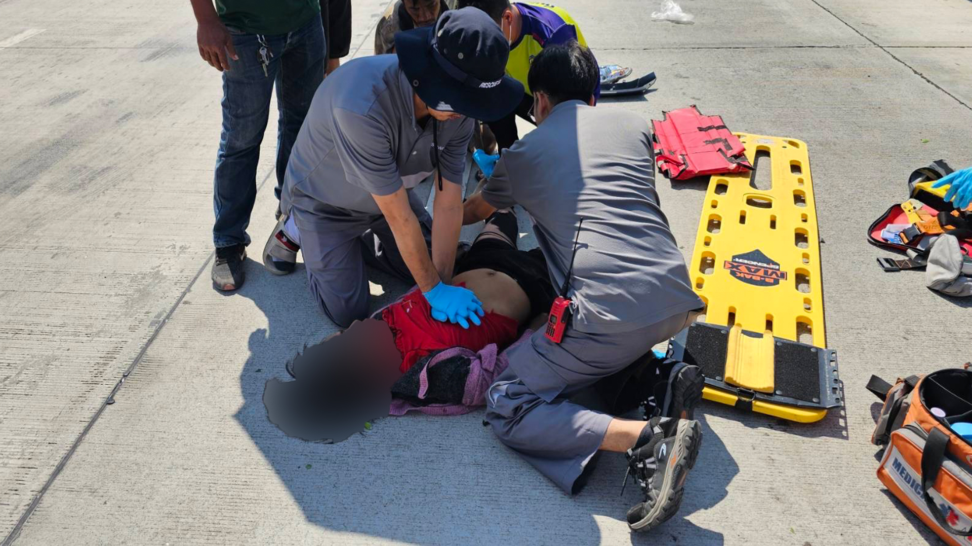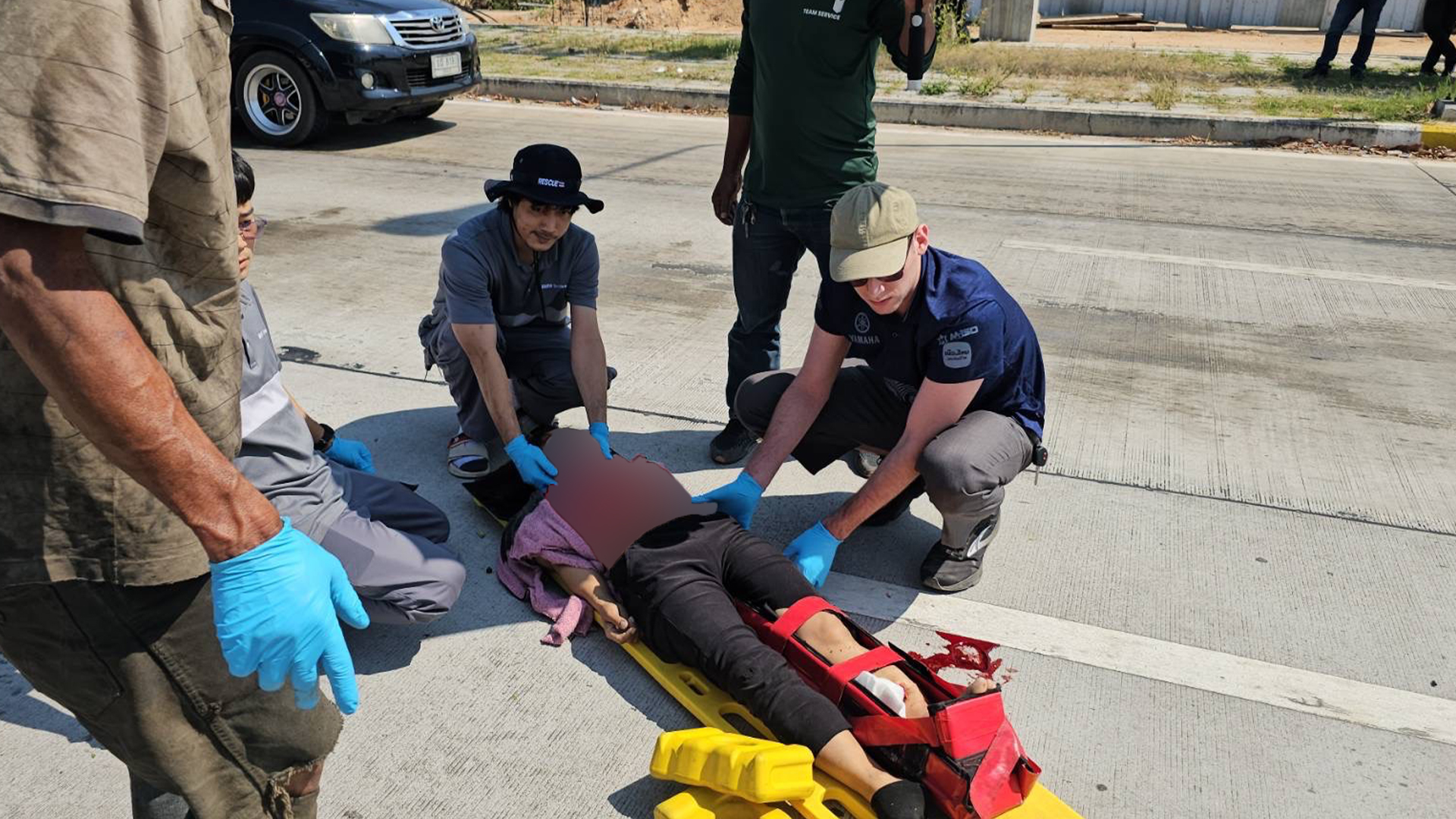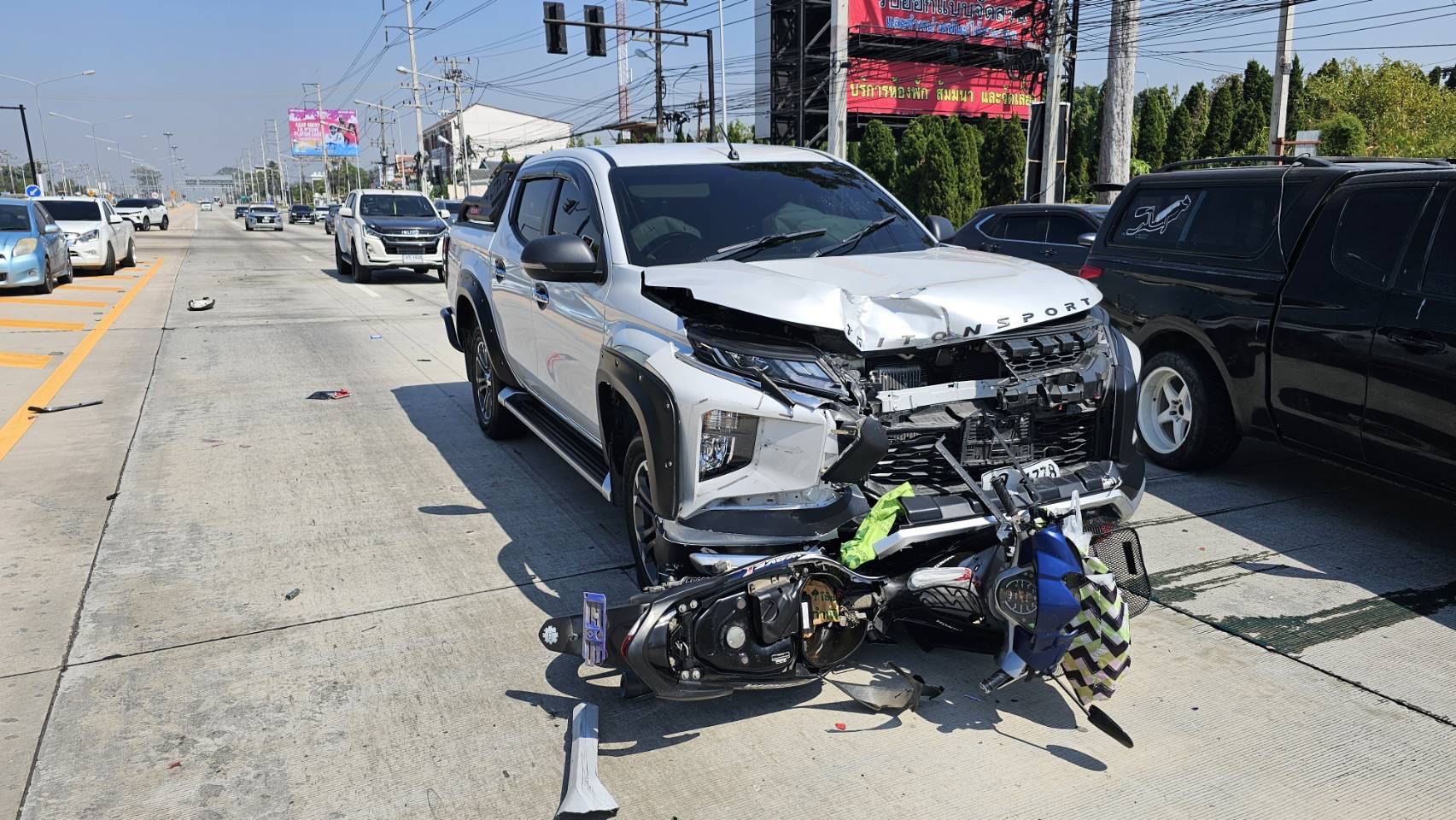 ที่เกิดเหตุพบผู้บาดเจ็บหญิง ต่างชาติ สัญชาติพม่า ทราบชื่อ Miss THITHIOO อายุ 39 ปี นอนจมกองเลือดอยู่กลางถนน ก่อน จนท.กู้ภัยจะทำการ CPR โดยมีบาดแผลขาซ้ายท่อนล่างผิดรูป แขนขวาท่อนบนผิดรูป โดย ทีมแพทย์พยาบาล ช่วยเหลือ นำส่ง รพ. วัดญาณสังวรารามวรมหาวิหาร ก่อนเสียชีวิตในเวลาต่อมา หลังขับขี่ จยย. Honda Wave 110 i สีน้ำเงินดำ ในสภาพพังเสียหาย ถูกอัดติดอยู่หน้า รถกระบะ Mitsubishi Triton สีขาว โดยมี นาง คงภัค อายุ 71 ปี เป็นผู้ขับขี่ ยืนรอให้การ กับ จนท.ตำรวจ