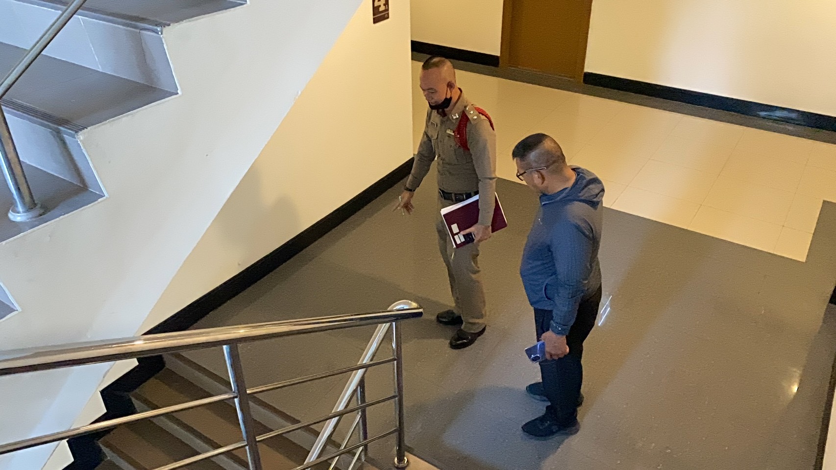 พนักงานคอนโดฯให้ข้อมูลว่า ได้ยินเสียงผู้หญิงกับผู้ชายทะเลาะกัน ดังมาจากชั้น 6 จากนั้นได้ยินเสียงปืนดังขึ้น 2 นัด บริเวณบันไดหนีไฟชั้น 4 จึงรีบวิ่งมาตรวจสอบก็พบว่าคนเจ็บ นอนหมดสติจมกองเลือดอยู่ที่ จากนั้นถัดมาอีกประมาณ 10 นาที ได้ยินเสียงปืนดังขึ้นอีก 1 นัด ดังมาจากห้องที่เกิดเหตุ ซึ่งเป็นห้องของผู้บาดเจ็บที่เป็นผู้หญิง จึงรีบโทรแจ้งเจ้าหน้าที่ตำรวจดังกล่าว