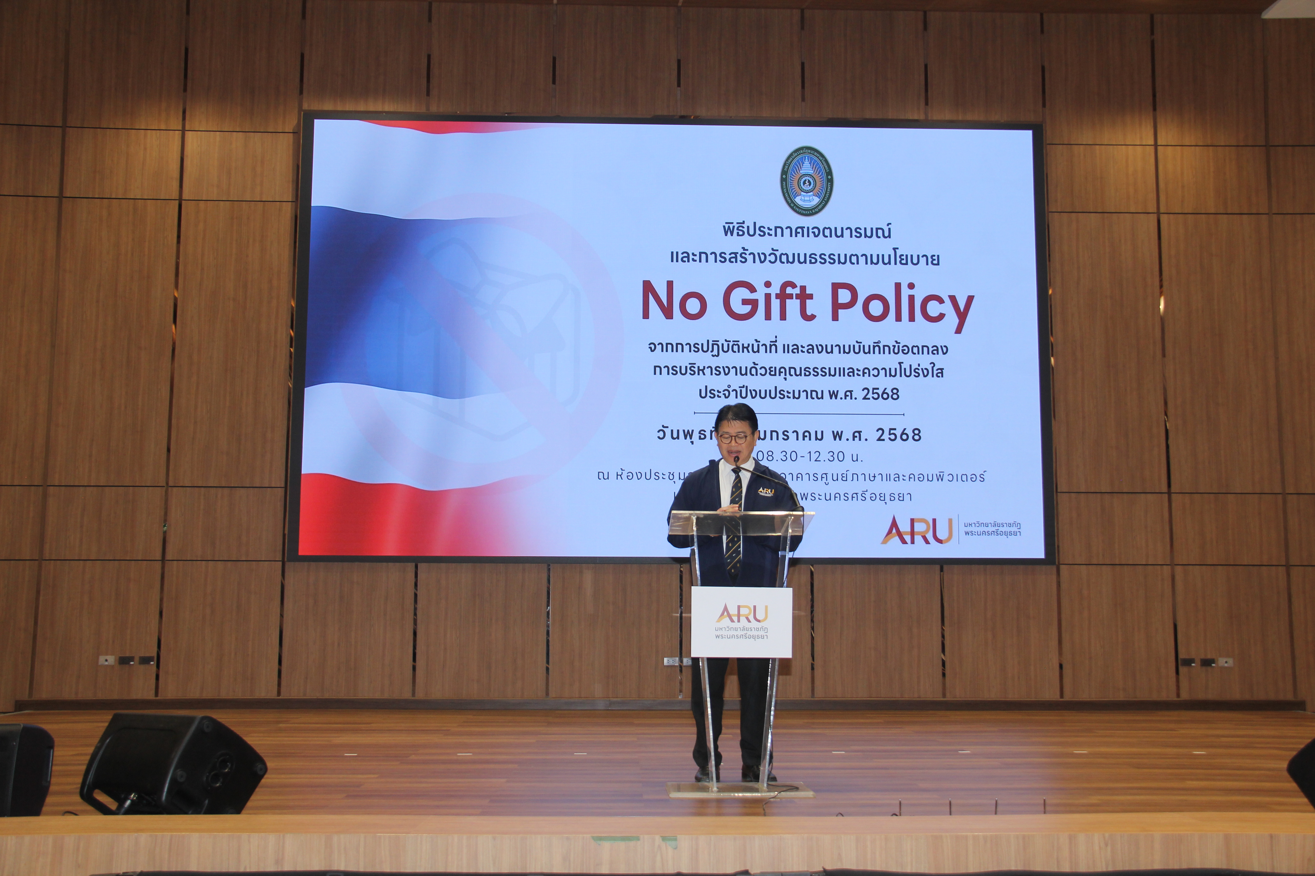 รองศาสตราจารย์ ดร.ธาตรี มหันตรัตน์ รองอธิการบดีฝ่ายบริหารทรัพยากร กล่าวว่าพิธีประกาศเจตนารมณ์ No Gift Policy จากการปฏิบัติหน้าที่และลงนามบันทึกข้อตกลงการบริหารงานด้วยคุณธรรมและความโปร่งใส ประจำปีงบประมาณ พ.ศ. 2568 ของมหาวิทยาลัยราชภัฏพระนครศรีอยุธยา ถือเป็นส่วนหนึ่งที่สอดคล้องตามแผนแม่บทภายใต้ยุทธศาสตร์ชาติ ประเด็นการต่อต้านการทุจริตและประพฤติมิชอบ ด้านการป้องกันและปราบปรามการทุจริตและประพฤติมิชอบ เพื่อให้ทุกหน่วยงานและบุคลากรทุกภาคส่วนได้ตระหนักเกรงกลัวต่อการทุจริตทุกรูปแบบ รวมทั้งเป็นเวทีที่สร้างความเชื่อมั่นให้กับผู้มีส่วนได้ส่วนเสียทั้งภายในและภายนอก ภาคประชาชน ท้องถิ่น และนักศึกษา เป็นต้น