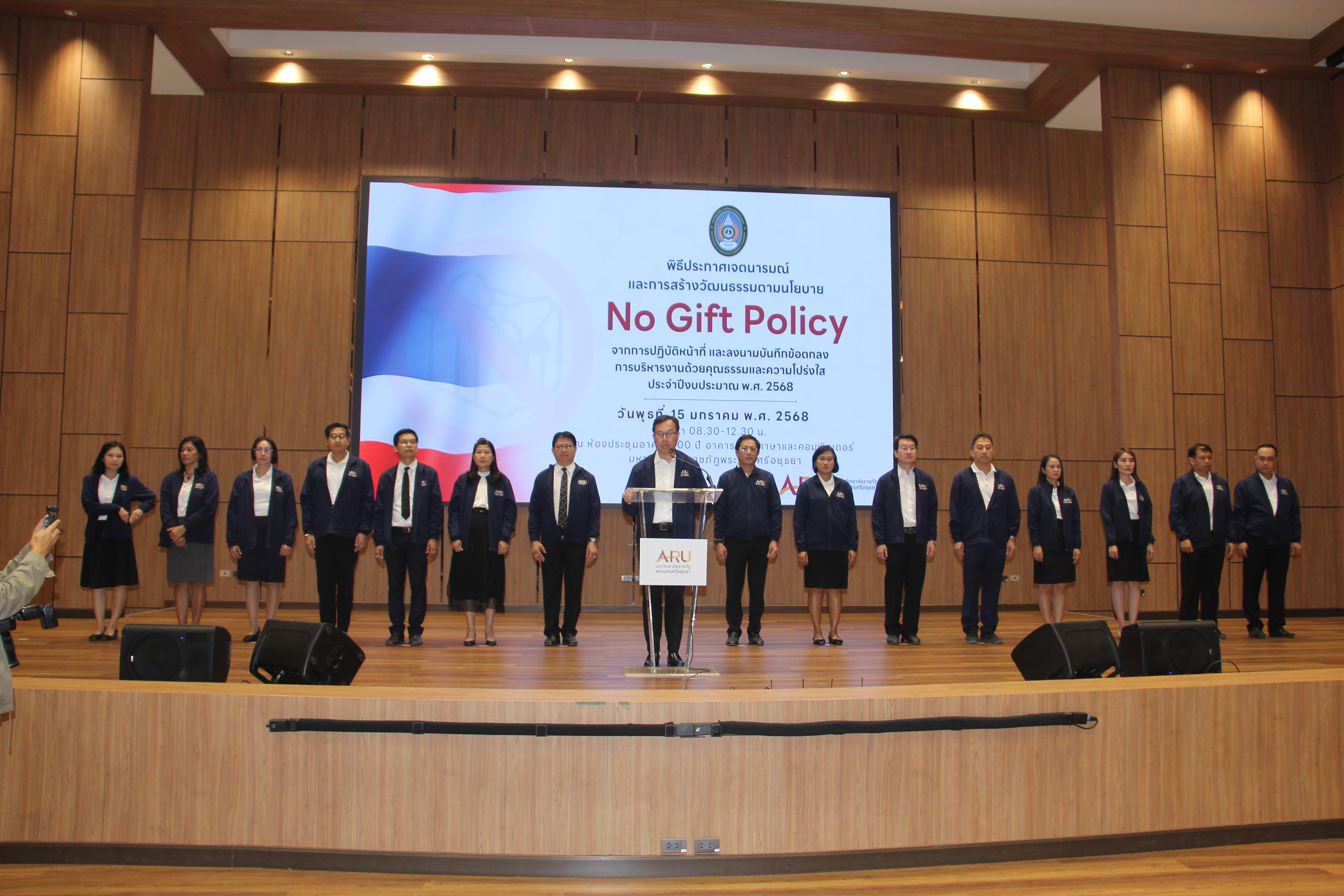 เมื่อวันที่ 15 มกราคม 2568 ณ ห้องประชุมอาคาร 100 ปี ศูนย์ภาษาและคอมพิวเตอร์ มหาวิทยาลัยราชภัฏพระนครศรีอยุธยา รองศาสตราจารย์ ดร.ชูสิทธิ์ ประดับเพ็ชร์ อธิการบดีมหาวิทยาลัยราชภัฏพระนครศรีอยุธยา นำรองอธิการบดี ผู้ช่วยอธิการบดี คณบดี ผู้อำนวยการสถาบัน/สำนัก คณาจารย์ เจ้าหน้าที่และตัวแทนนักศึกษา ประกาศเจตนารมณ์และการสร้างวัฒนธรรมตามนโยบาย No Gift Policy จากการปฏิบัติหน้าที่ และลงนามบันทึกข้อตกลงการบริหารงานด้วยคุณธรรมและความโปร่งใส