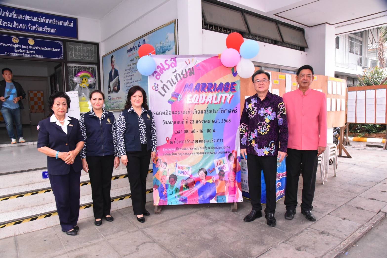ผู้ว่าราชการจังหวัดฉะเชิงเทรา พร้อมด้วยนางปิติมา รักพานิชมณี นายกเหล่ากาชาดจังหวัดฉะเชิงเทรา ประธานแม่บ้านมหาดไทยจังหวัดฉะเชิงเทรา นายสุรชัย โคตรบุตรดี นายอำเภอเมืองฉะเชิงเทรา และคณะร่วมเป็นสักขีพยานการจดทะเบียนสมรสเท่าเทียม และกล่าวแสดงความยินดีกับคู่รัก LGBTQ+ ที่มาร่วมจดทะเบียนในวันนี้