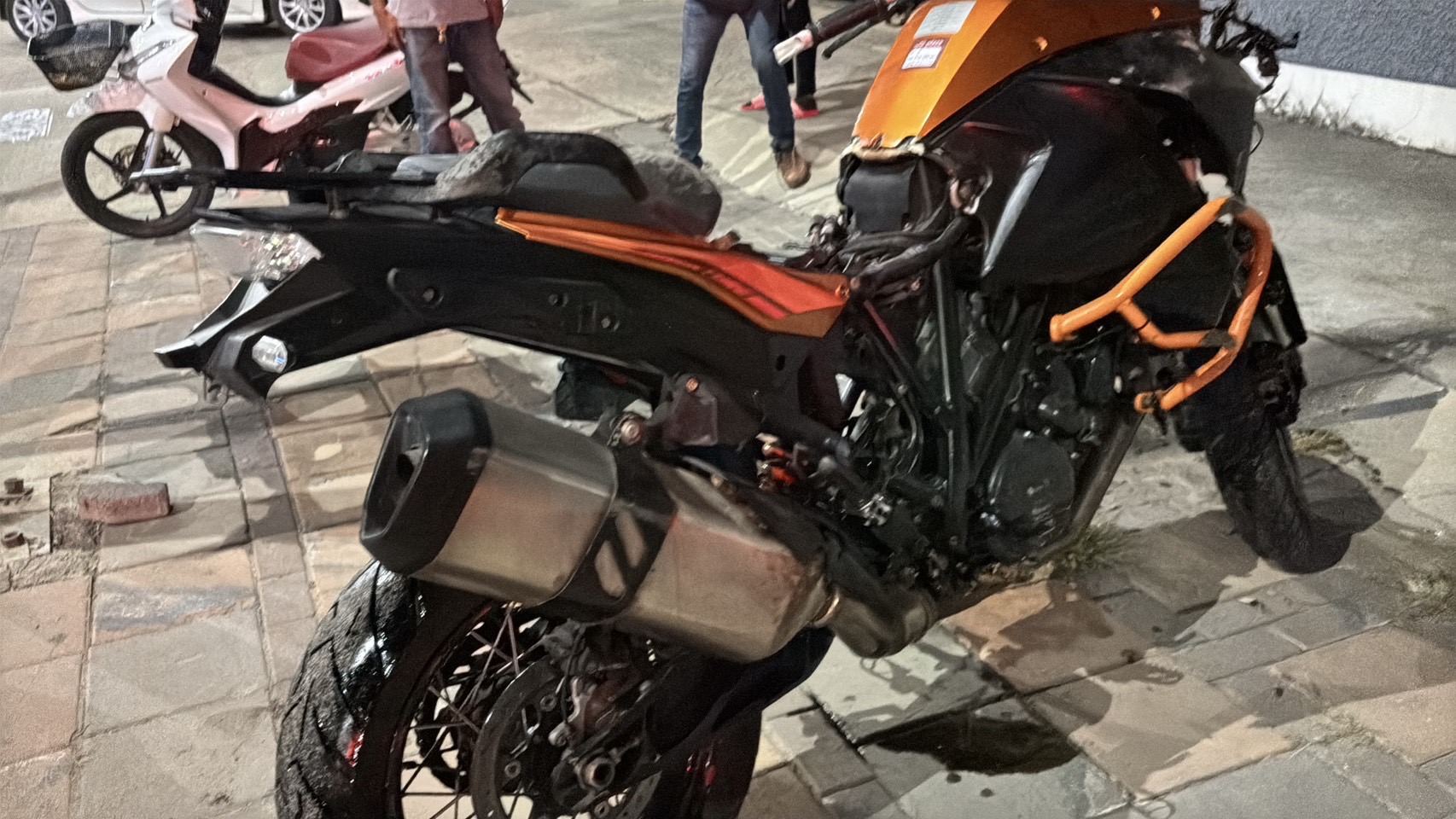 ที่เกิดเหตุพบ รถจักรยานยนต์บิ๊กไบค์ยี่ห้อ KTM 1200 ซีซี ล้มคว่ำได้รับความเสียหาย พบผู้ได้รับบาดเจ็บรายแรก เป็นผู้ขับขี่รถบิ๊กไบค์ทราบชื่อคือ MR.ARTEM AVDEEV อายุ 26 ปี ไม่ทราบสัญชาติ รายที่สองเป็นบุคคลเดินเท้าทราบชื่อภายหลังคือMISS ZHANNA DZHUROVA อายุ 44 ปี สัญชาติรัสเซีย เจ้าหน้าที่กู้ภัยฯปฐมพยาบาลเบื้องต้น ก่อนเคลื่อนย้ายส่งโรงพยาบาล ส่วนรายที่สามเป็นชาวต่างประเทศยังไม่ทราบชื่อและสัญชาติที่แท้จริง เป็นสามีของรายที่สองเดินจูงมือกันข้ามถนน ได้รับบาดเจ็บสาหัสเจ้าหน้าที่กู้ภัยฯ ให้การช่วยเหลือปั๊มหัวใจเพื่อยื้อชีวิตแต่ผู้บาดเจ็บทนผิดบาดแผลไม่ไหวจึงเสียชีวิตในเวลาต่อมา