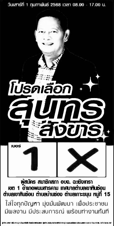 วันที่ 30 ม.ค.68 ผู้สื่อข่าวรายงานว่า นายสุนทร สังขาร อายุ 57 ปี ผู้สมัครสมาชิกสภาองค์การบริหารส่วนจังหวัดฉะเชิงเทรา (ส.อบจ.) อำเภอพนมสารคาม เขต1 เบอร์ 1 ได้เสียชีวิตที่โรงพยาบาล เมื่อคืนที่ผ่านมา อย่างสงบ หลังจากป่วยโรคเส้นเลือดในสมอง ขณะออกรณรงค์หาเสียงเลือกตั้ง