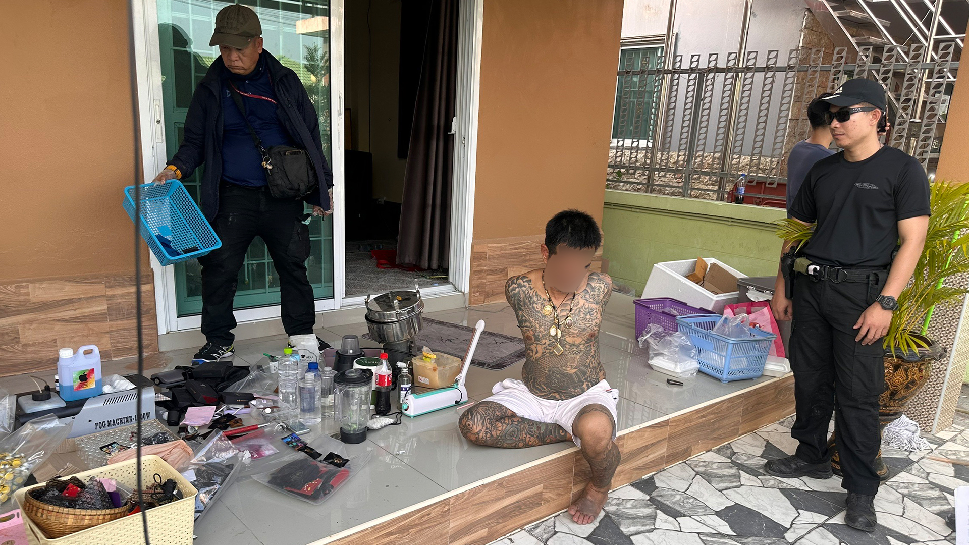 เมื่อเวลา 15.00 น. วันที่ 1 กุมภาพันธ์ 2568 พล.ต.ต.ธวัชเกียรติ จินดาควรสนอง ผบก.ชลบุรี พ.ต.อ.ภาสกร ไพจิตต์ ผกก.สืบสวน จ.ชลบุรี ตร.ชุดสืบสวนบก.น.5 ได้เข้าตรวจค้นบ้านเลขที่ 111 / 225 หมู่ 1 ตำบลคลองตำหรุ อำเภอเมือง จังหวัดชลบุรี จับกุม “เบนซ์ ท่าทราย” นายธนวัฒน์ ดู่คำ อายุ 42 ปีพร้อมของกลางเป็นอาวุธปืนนานาชนิดเจ้าหน้าที่ปิดล้อมที่ บ้านเลขที่ 111/225 หมู่ 1 ตำบลคลองตำหรุ อำเภอเมือง จังหวัดชลบุรี ขณะจับกุมจนท.ตร.ใช้เวลานาน กว่าจะได้เข้าค้นบ้านได้ เนื่องจากภายในบ้านมีหมาดุ เฝ้าบ้านอยู่ จนท.ต้อง รอระยะเวลา เพราะมีรายงานว่าภายในบ้านมีอาวุธปืนจำนวนมาก ก็ต้องรอบกำลังจากหน่วยบูรพา 481 (บก.ปพ.สส.2) จากการตรวจค้น พบอุปกรณ์ การผลิตยาเสพติด เครื่องบดยา เครื่องปั่น เครื่องซีลถุง พร้อมอาวุธปืนสั้น-ยาว จำนวนหลายกระบอก นอกจากนี้ยังตรวจพบนาฬิกาหรู ทองคำ กระเป๋าแบรนเนม รถโตโยต้า กับ รถมอเตอร์ไซต์ ยี่ฮ่อ ฮาเล่ เดวิสัน