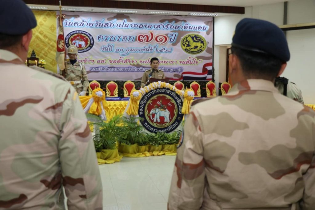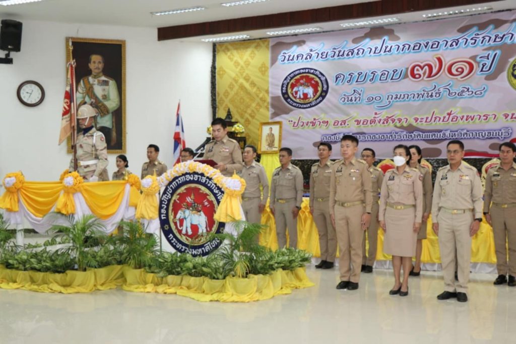 วันนี้ (10 กุมภาพันธ์ 2568) เวลา 08.30 น. ณ หอประชุมกำนัน ผู้ใหญ่บ้าน อำเภอเมืองกาญจนบุรี จังหวัดกาญจนบุรี นายกองเอก อธิสรรค์ อินทร์ตรา ผู้บังคับการกองอาสารักษาดินแดนจังหวัดกาญจนบุรี เป็นประธานในพิธีกระทำสัตย์ปฏิญาณตนต่อธงประจำกองอาสารักษาดินแดนจังหวัดกาญจนบุรี(ธงชัยเฉลิมพล) เนื่องในวันคล้ายวันสถาปนากองอาสารักษาดินแดน ครบรอบปีที่ 71 พร้อมด้วย นางสาวกิตติยา จึงรุ่งเจริญกิจ ประธานแม่บ้านมหาดไทยจังหวัดกาญจนบุรี ว่าที่นายกองเอก วุฒิพงษ์ สุภัควนิช ว่าที่นายกองเอก พรรณวิภา ปิยัมปุตระ รองผู้บังคับการกองอาสารักษาดินแดนจังหวัดกาญจนบุรี ว่าที่นายกองเอก ฑรัท เหลืองสอาด หัวหน้าฝ่ายอำนวยการกองบังคับการกองอาสา รักษาดินแดนจังหวัดกาญจนบุรี ผู้บังคับกองร้อยอาสารักษาดินแดนทุกอำเภอ หัวหน้าส่วนราชการ ทหาร ตำรวจ สมาชิกชมรมแม่บ้านมหาดไทยจังหวัดกาญจนบุรี และสมาชิกกองอาสารักษาดินแดน เข้าร่วมในพิธีฯ