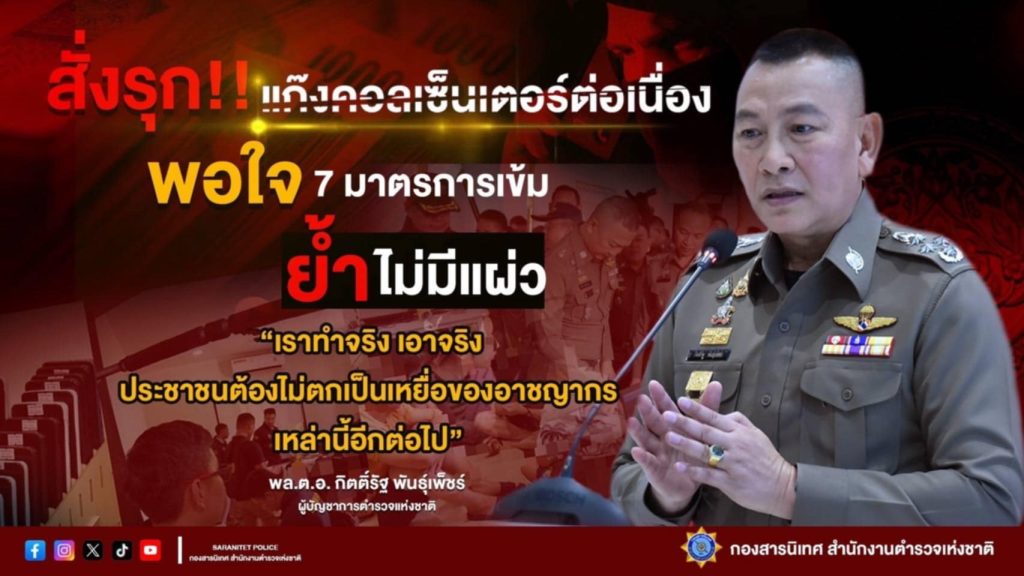วันนี้ (8 กุมภาพันธ์ 2567) พล.ต.อ.กิตติ์รัฐ พันธุ์เพ็ชร์ ผู้บัญชาการตำรวจแห่งชาติ เปิดเผยความคืบหน้าปฏิบัติการปราบปรามแก๊งคอลเซ็นเตอร์ ว่า หลังจากที่ออกนโยบาย 7 มาตรการเข้มข้น นับตั้งแต่วันที่ 20 มกราคม 2568 และขีดเส้นตาย 7 วันให้ทุกหน่วยดำเนินการ พบว่าผลการดำเนินงานตาม 7 มาตรการเข้มข้น ทั้งด้านการปราบปราม การป้องกัน การให้ความช่วยเหลือ เห็นผลการปฏิบัติเป็นที่น่าพอใจ จึงสั่งการให้ทุกหน่วยปฏิบัติที่เกี่ยวข้อง โดยเฉพาะอย่างยิ่งศูนย์ต่อต้านการค้ามนุษย์ สำนักงานตำรวจแห่งชาติ (ศตคม.ตร.) และศูนย์ป้องกันปราบปรามอาชญากรรมทางเทคโนโลยี สำนักงานตำรวจแห่งชาติ (ศปอส.ตร.) ซึ่งมี พล.ต.อ.ธัชชัย ปิตะนีละบุตร จเรตำรวจแห่งชาติ เป็นผู้อำนวยการศูนย์ เดินหน้าขับเคลื่อนการปฏิบัติต่อเนื่องอย่างเต็มกำลัง เพื่อสกัดกั้นและปราบปรามอาชญากรรมเหล่านี้ให้เห็นผลเป็นรูปธรรมต่อไป