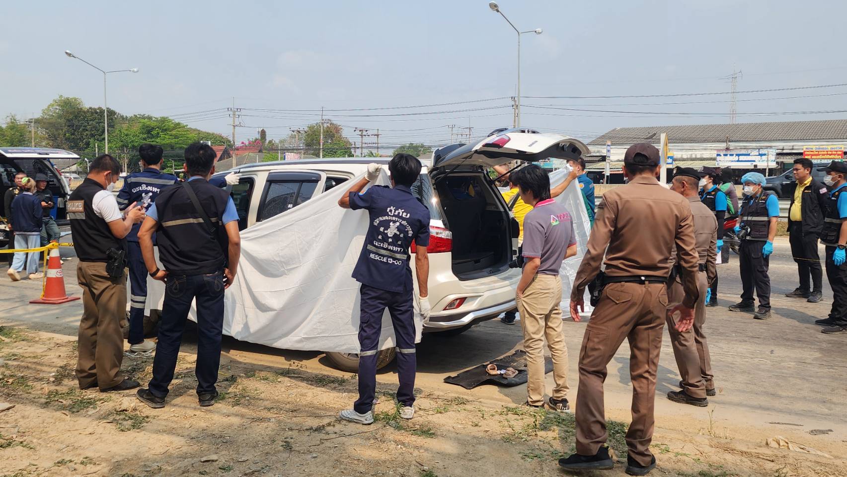 โดยที่เกิดเหตุพบรถเอสยูวี ยี่ห้อ อีซูซุ มิวเอ็กซ์ สีขาว บริเวณกระจกประตูซ้าย ฝั่งคนนั่ง พบรูกระสุน 1 รู จนกระจกแตก ภายในรถ พบผู้เสียชีวิต 2 ราย ลักษณะนังหัวชนกัน ฝั่งคนขับทราบชี่อคือนายฉัตรชัย ขอสงวนนามสกุล 33 ปี เป็นสมาชิกสภาเทศบาลแห่งหนึ่ง ถูกอาวุธปืนยิงเข้าขมับขวาทะลุซ้าย ในมือขวายังกำปืนขนาด 9 มม. ยี่ห้อซิกซาวเอร์ แมคกาซีน ส่วนเบาะนั่งด้านข้างกันพบร่างผู้เสียชีวิต ทราชื่อคือ น.ส.ณัฏฐณิชา ขอสงวนนามสกุล อายุ 26 ปี ถูกอาวุธปืนขนาดเดียวกันยิงเข้าที่บริเวณขมับขวาทะลุซ้ายเสียชีวิตเช่นเดียวกัน