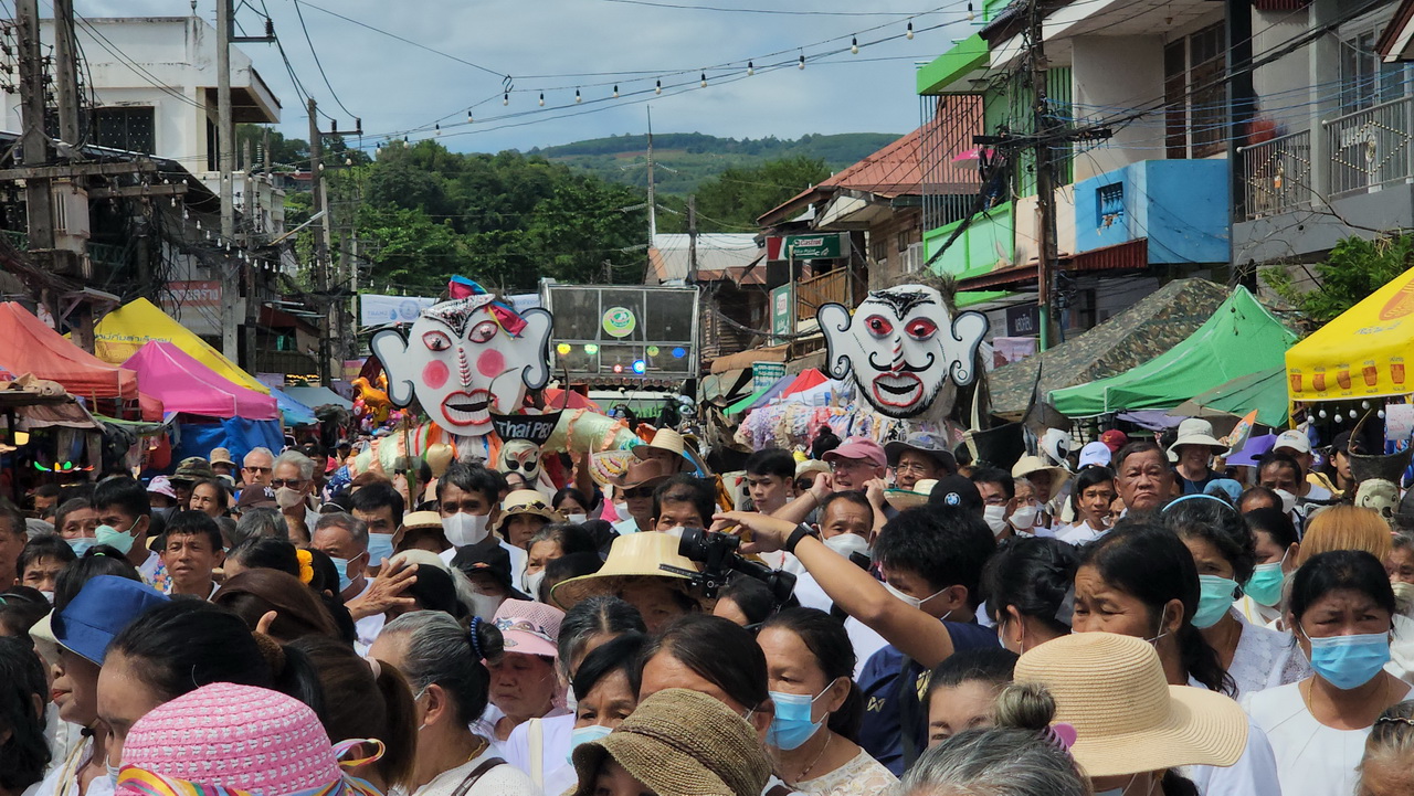 งานประเพณีงานบุญหลวงและการละเล่นผีตาโขน ปี 66 ณ วัดโพนชัย อ.ด่านซ้าย จ.เลย จัดขึ้นระหว่างวันที่ 23-25 มิ.ย.66 สำหรับวันนี้เป็นพิธีเปิดงานวันโฮม หรือวันแรกของงานประเพณีงานบุญ และการละเล่นผีตาโขน มีนักท่องเที่ยวชาวไทยและต่างชาติทยอยเข้ามาร่วมงานเป็นจำนวนมาก จนโรงแรม ที่พัก ในเขต อ.ด่านซ้าย อ.นาแห้ว และ อ.ภูเรือ เต็มหมด คาดว่าสร้างเม็ดเงินนับร้อยล้านบาท